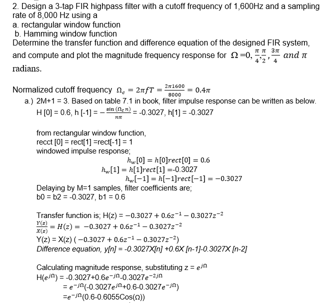 Digital Signal Processing 2. Design a 3-tap FIR highpass filter wi...