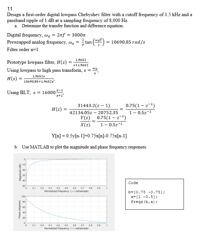 11. Design a first-order digital lowpass Chebyshev filter with a c...