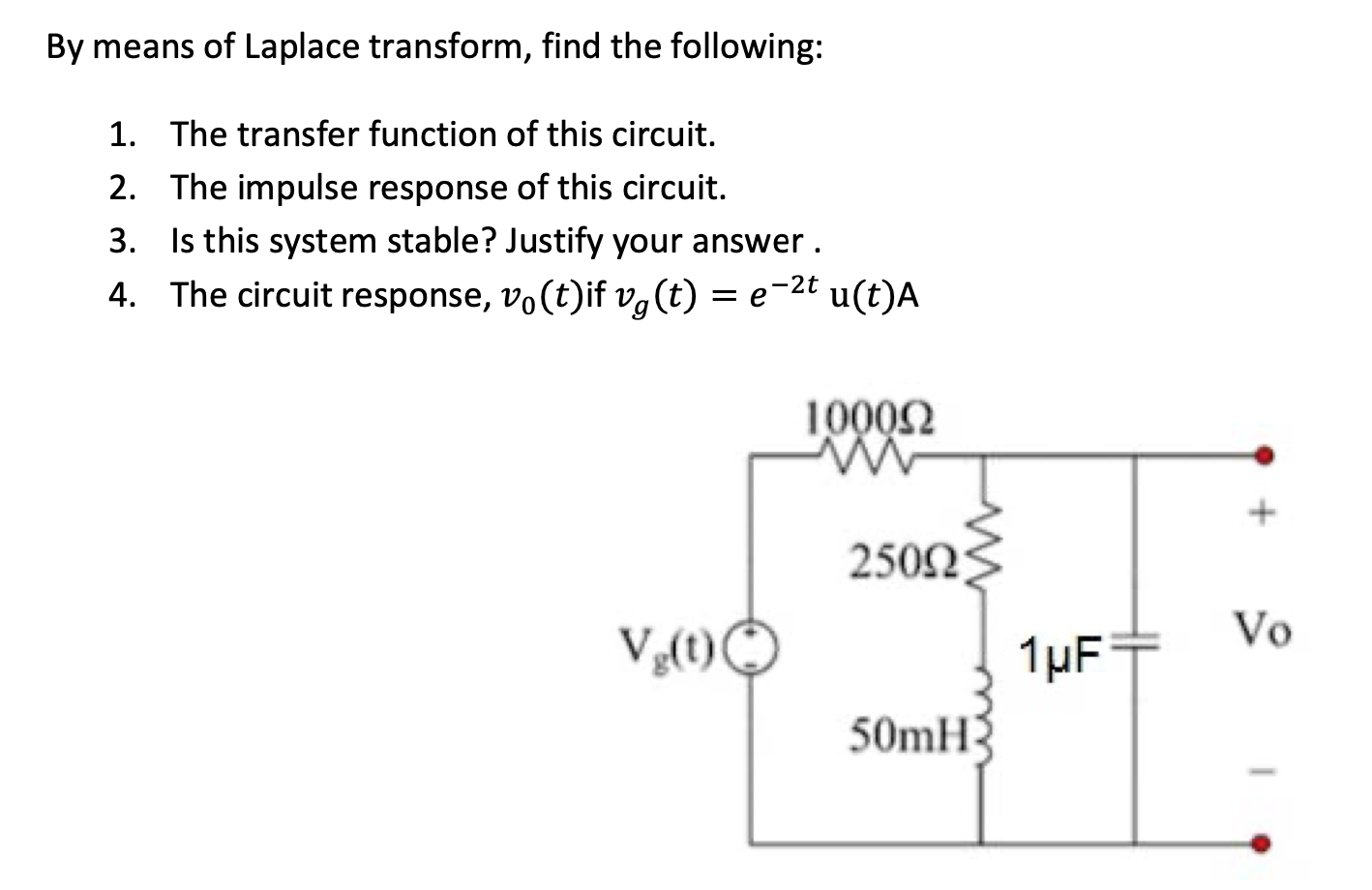 By means of Laplace transform, find the following: 1. The transfer...