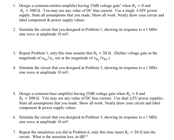 1. Design a common-emitter amplifier having 25dB voltage gain when...
