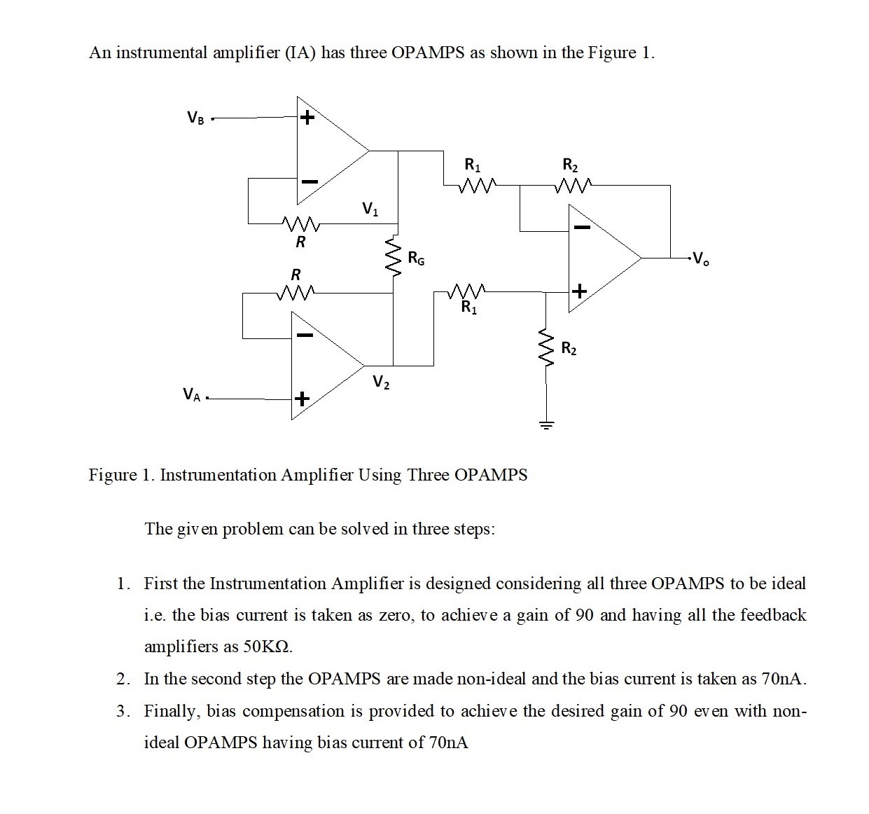 Design an Instrumentation amplifier using three non-ideal OPAMPS to...