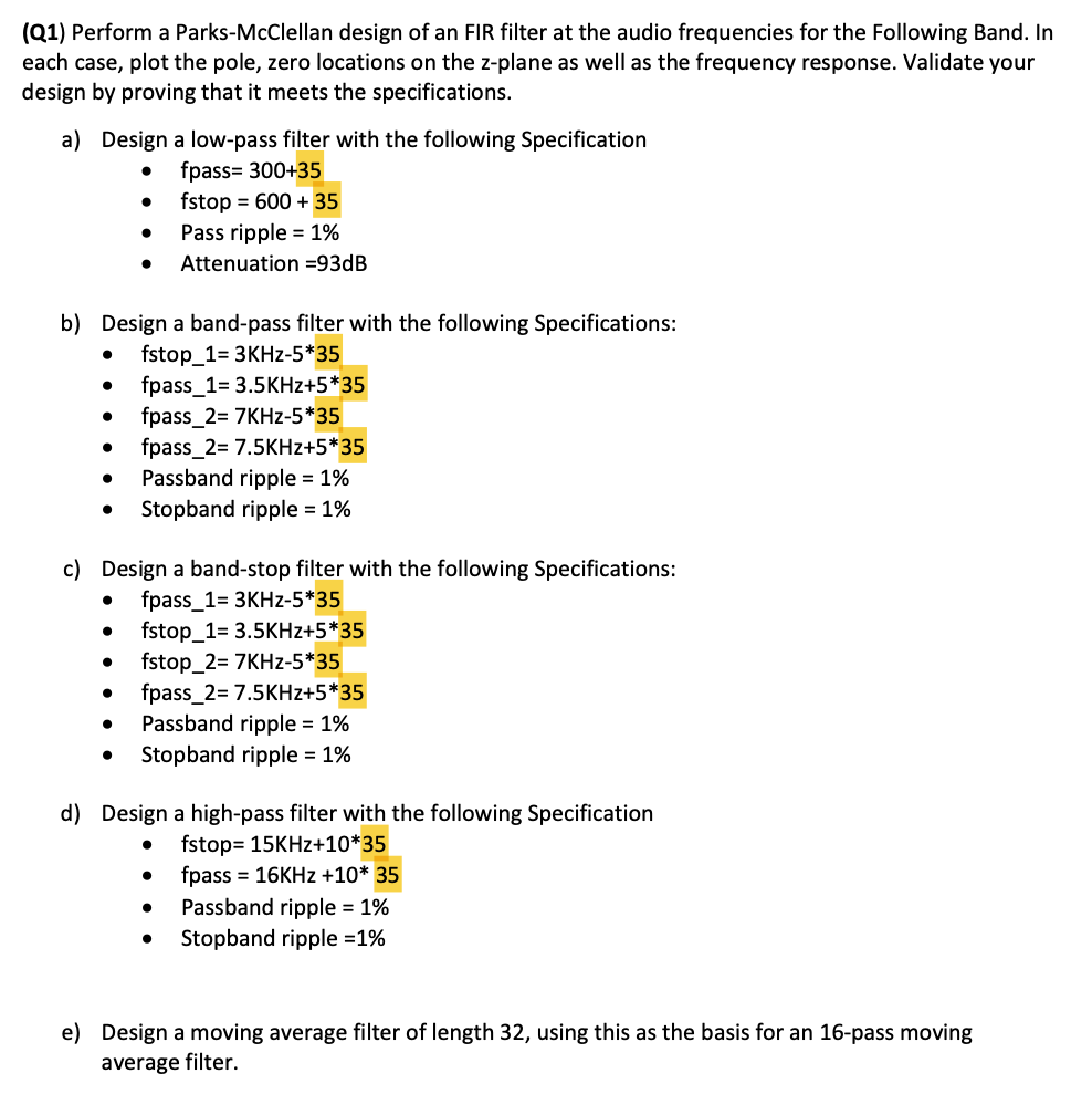 (Q1) Perform a Parks-McClellan design of an FIR filter at the audio...