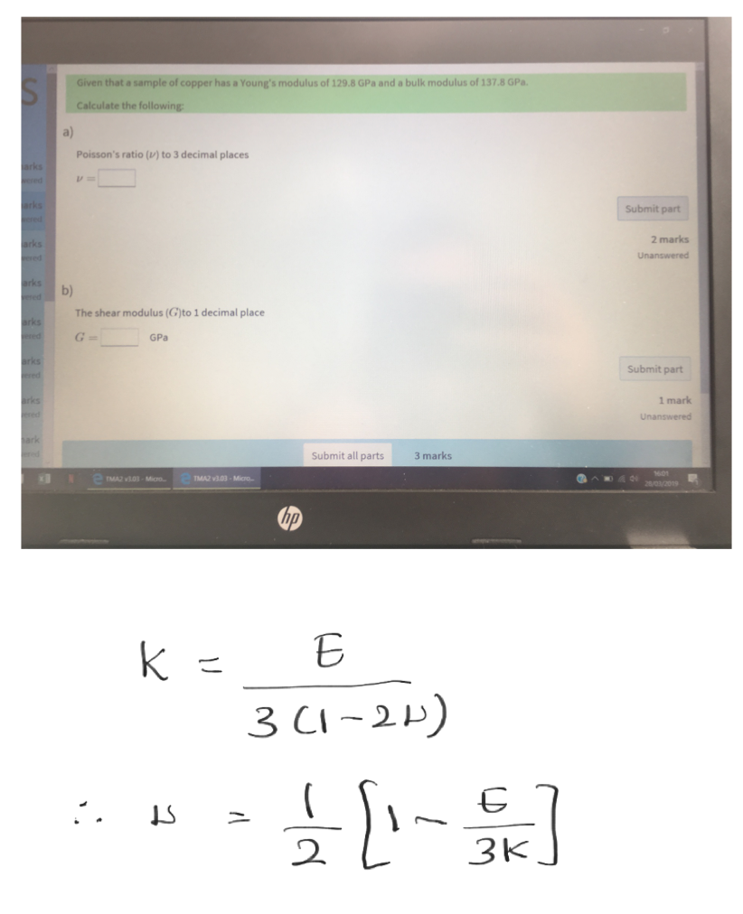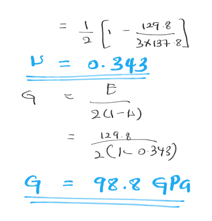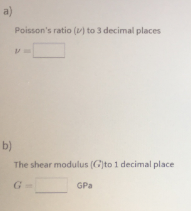 a) Poisson's ratio (v) to 3 decimal places V b) The shear modul...