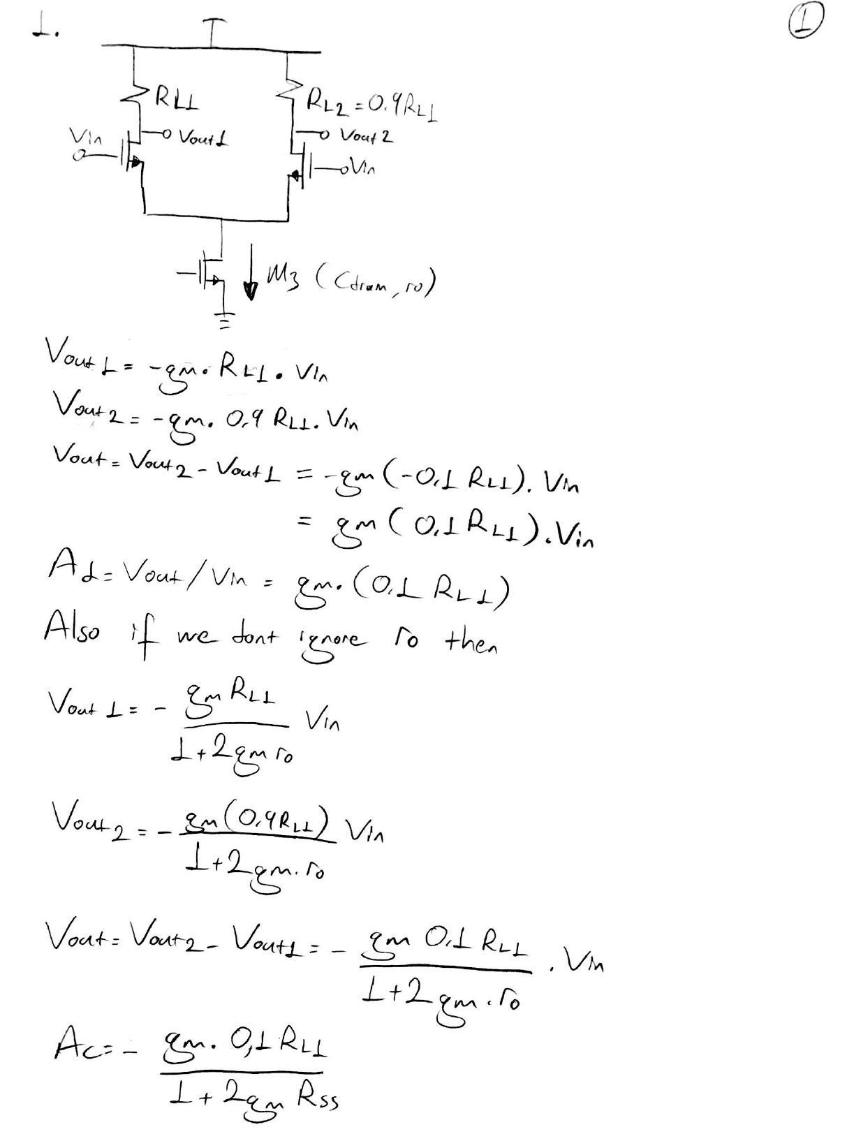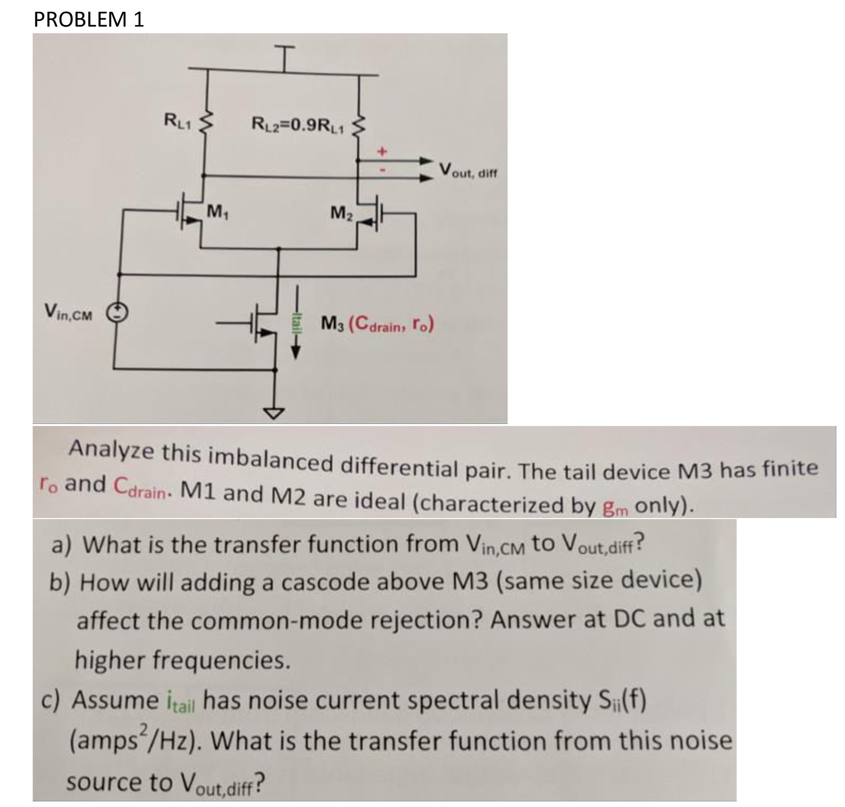 PROBLEM 1 RL1 RL2=0.9RL1 + Vout, diff M1 M2 Vin,cm M3 (Cdra...