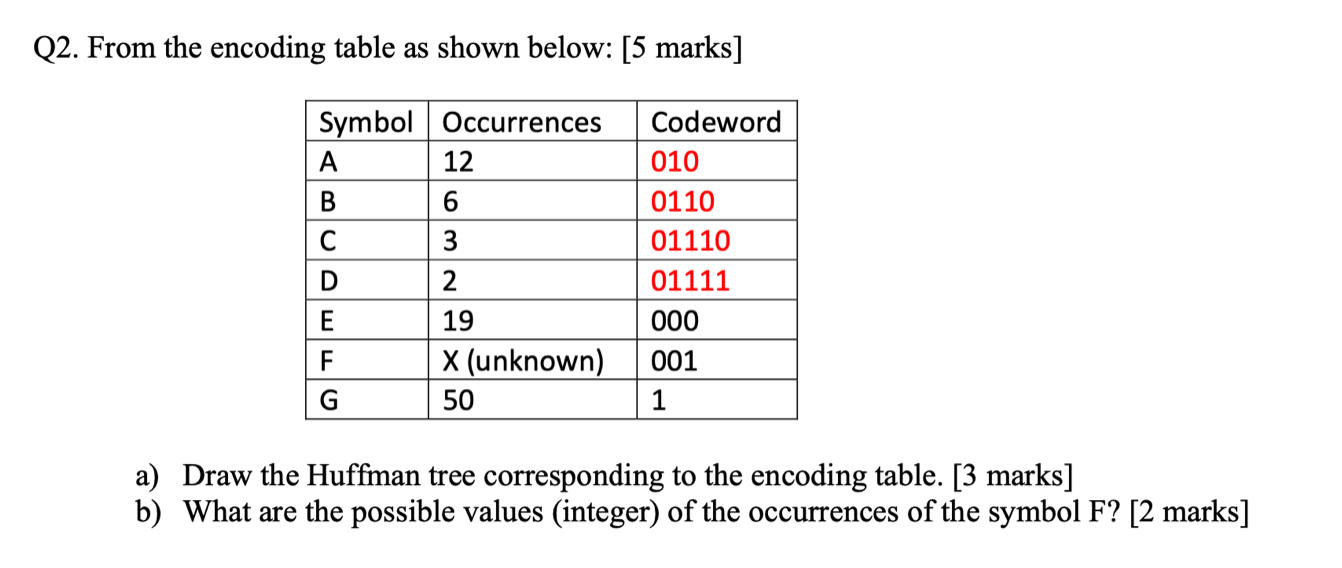 Q2. From the encoding table as shown below: [5 marks) Symbol Occu...