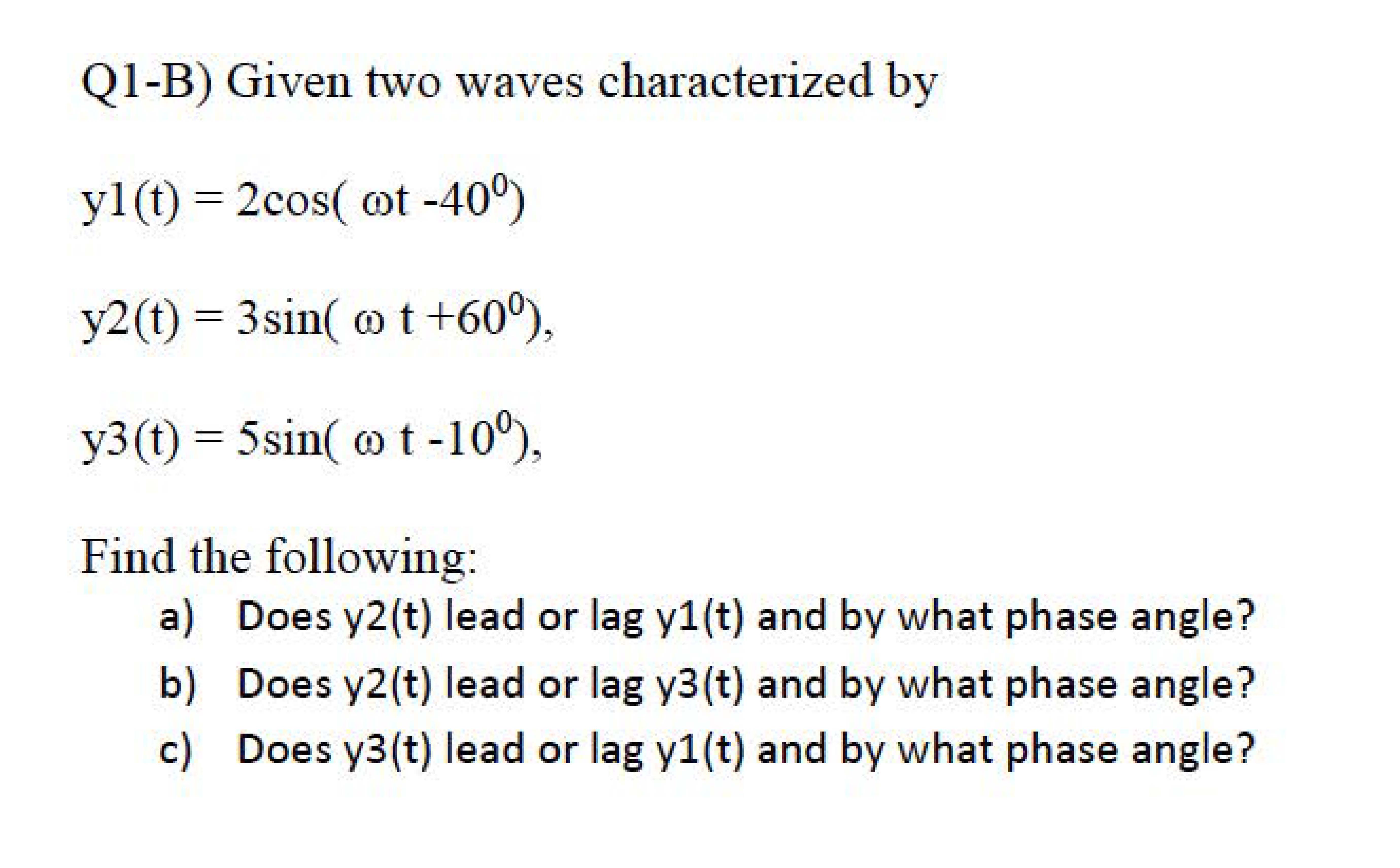 QI-B) Given two waves characterized by yl(t) 2cos( cot -40° y2(t...