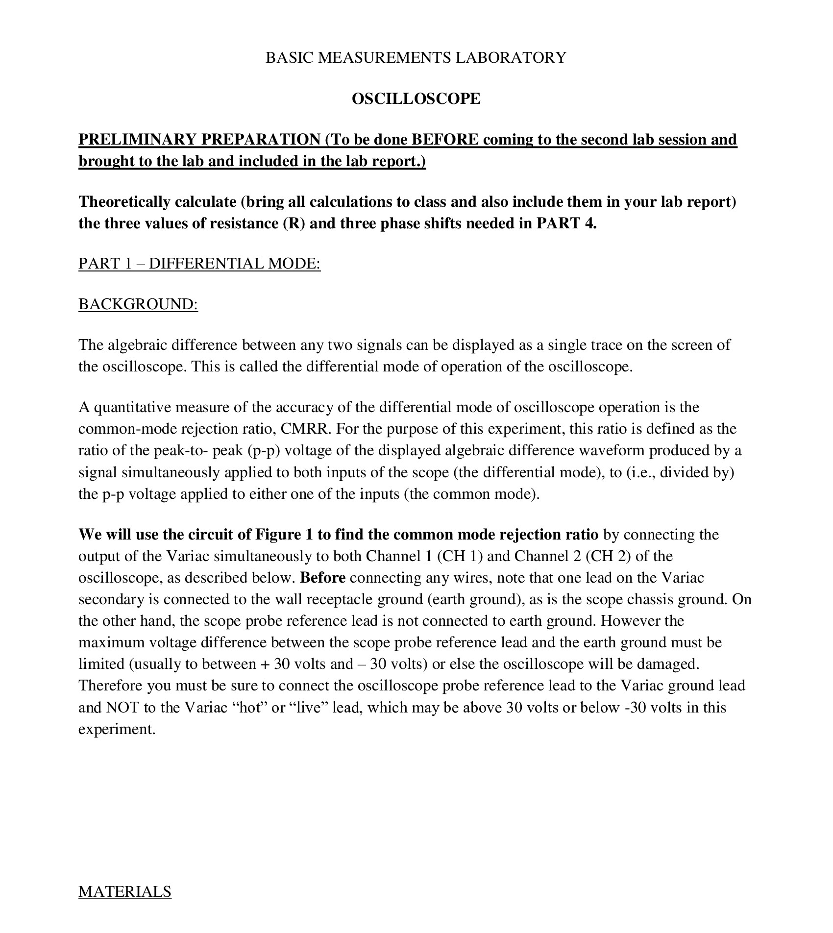 BASIC MEASUREMENTS LABORATORY OSCILLOSCOPE PRELIMINARY PREPARATIO...