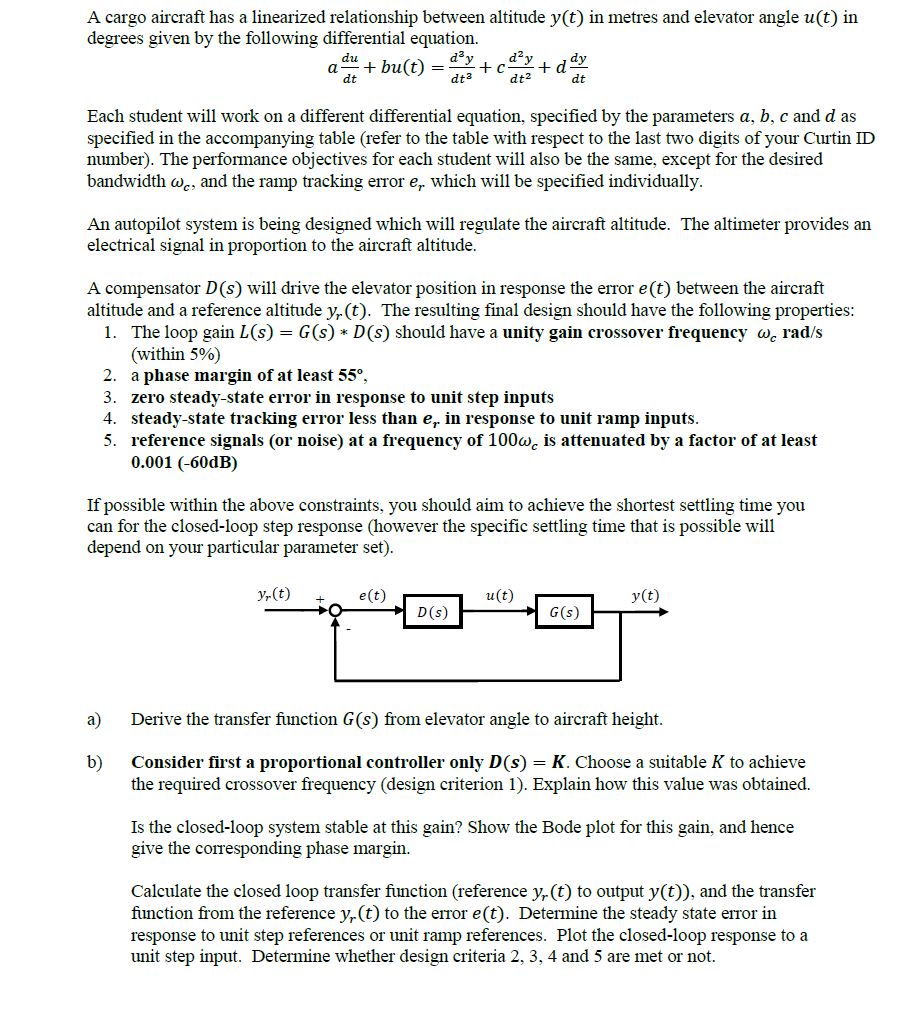 A cargo aircraft has a linearized relationship between altitude y(t...