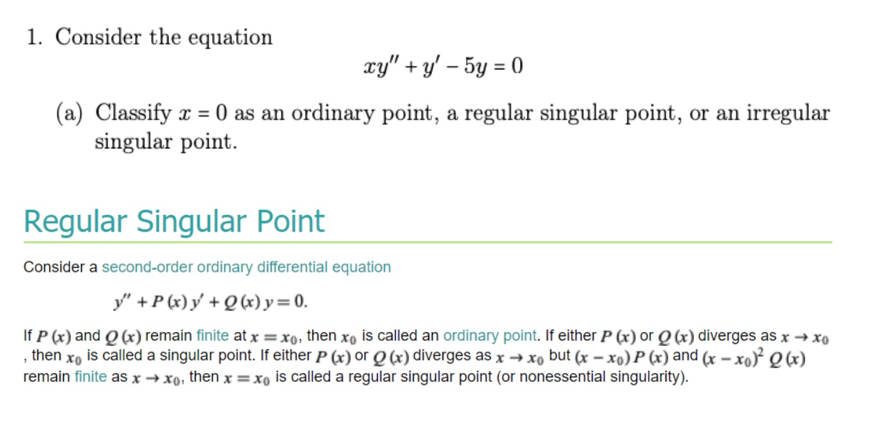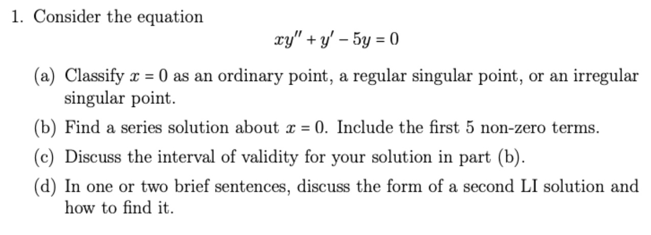 1. Consider the equation ry"+y'-5y=0 - = (a) Classify x = 0 ...