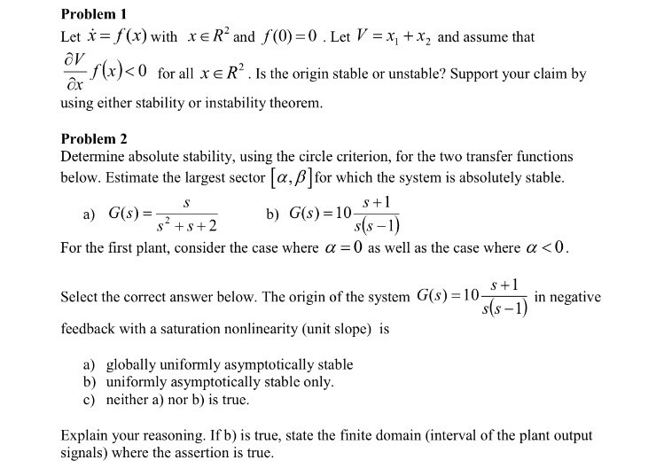 Problem 1 Let x = f(x) with xeR² and f(0)=0. Let V = X1 + X2 an...