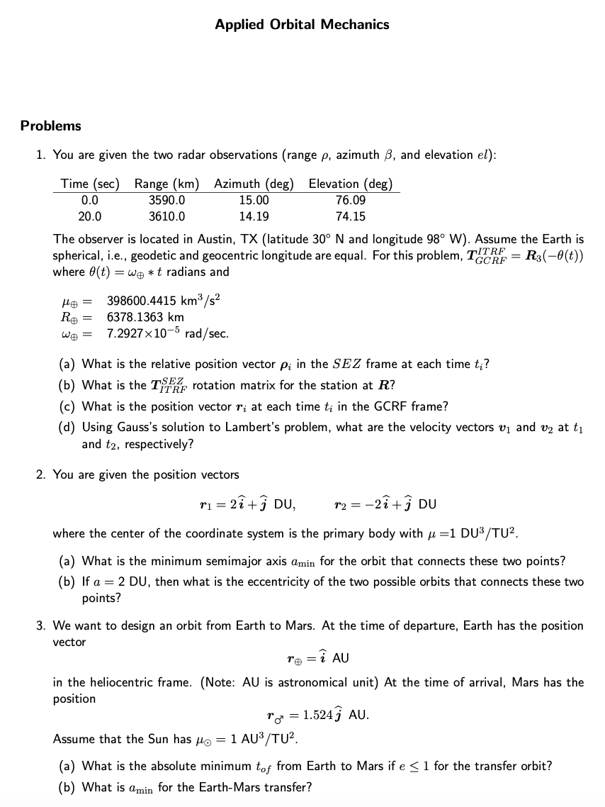 Applied Orbital Mechanics Problems 1. You are given the two radar...
