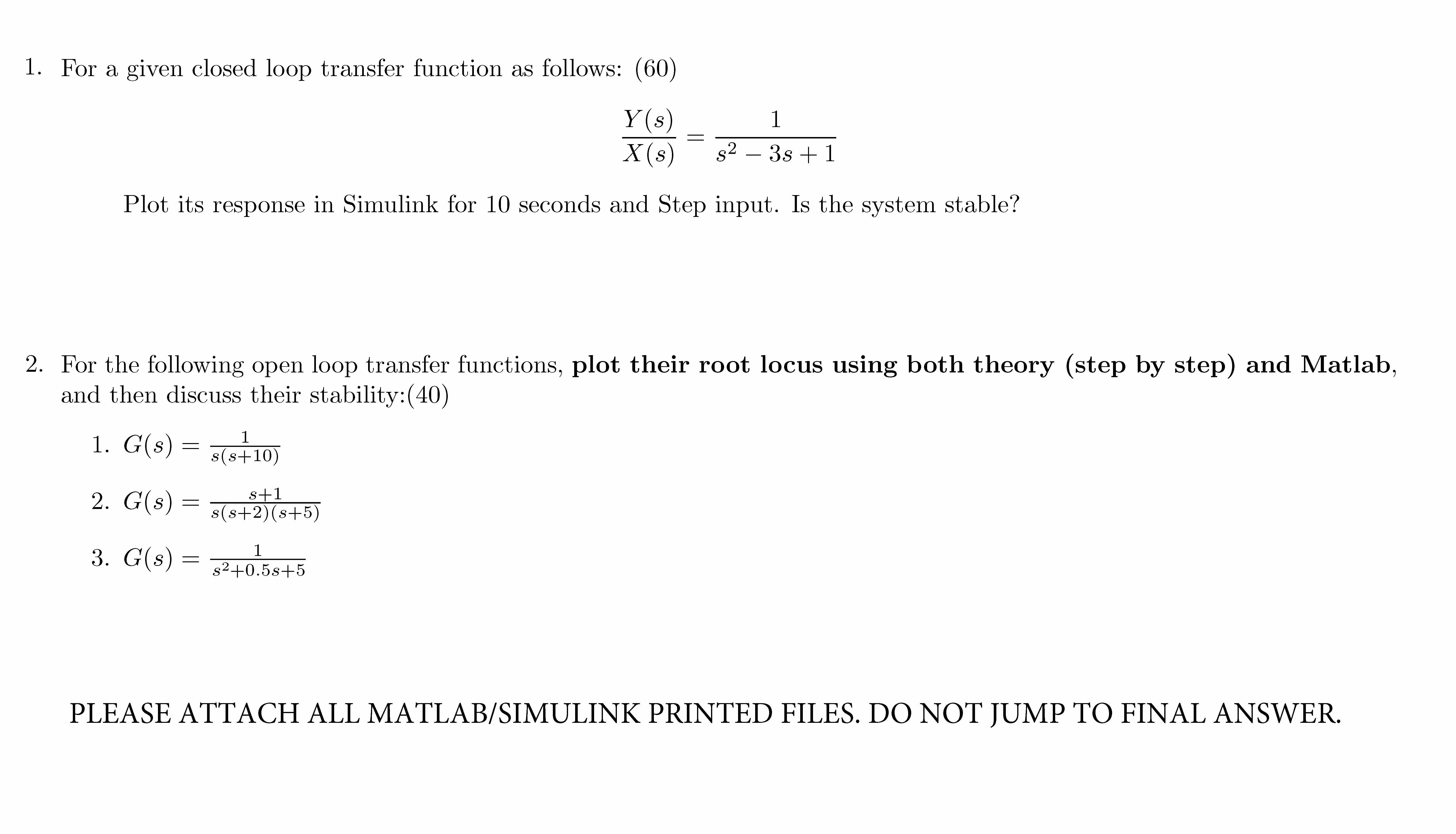 1. For a given closed loop transfer function as follows: (60) Y(s)...