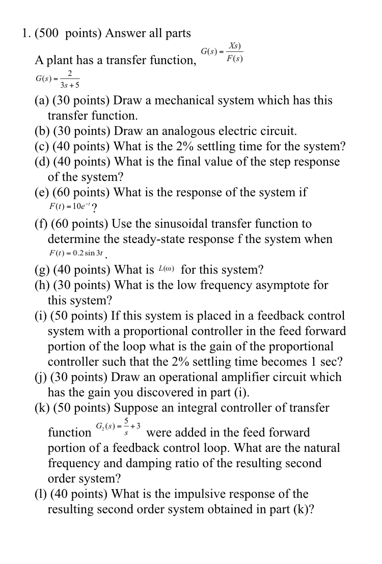 1. (5OO points) Answer all parts A plant has a transfer function, G...