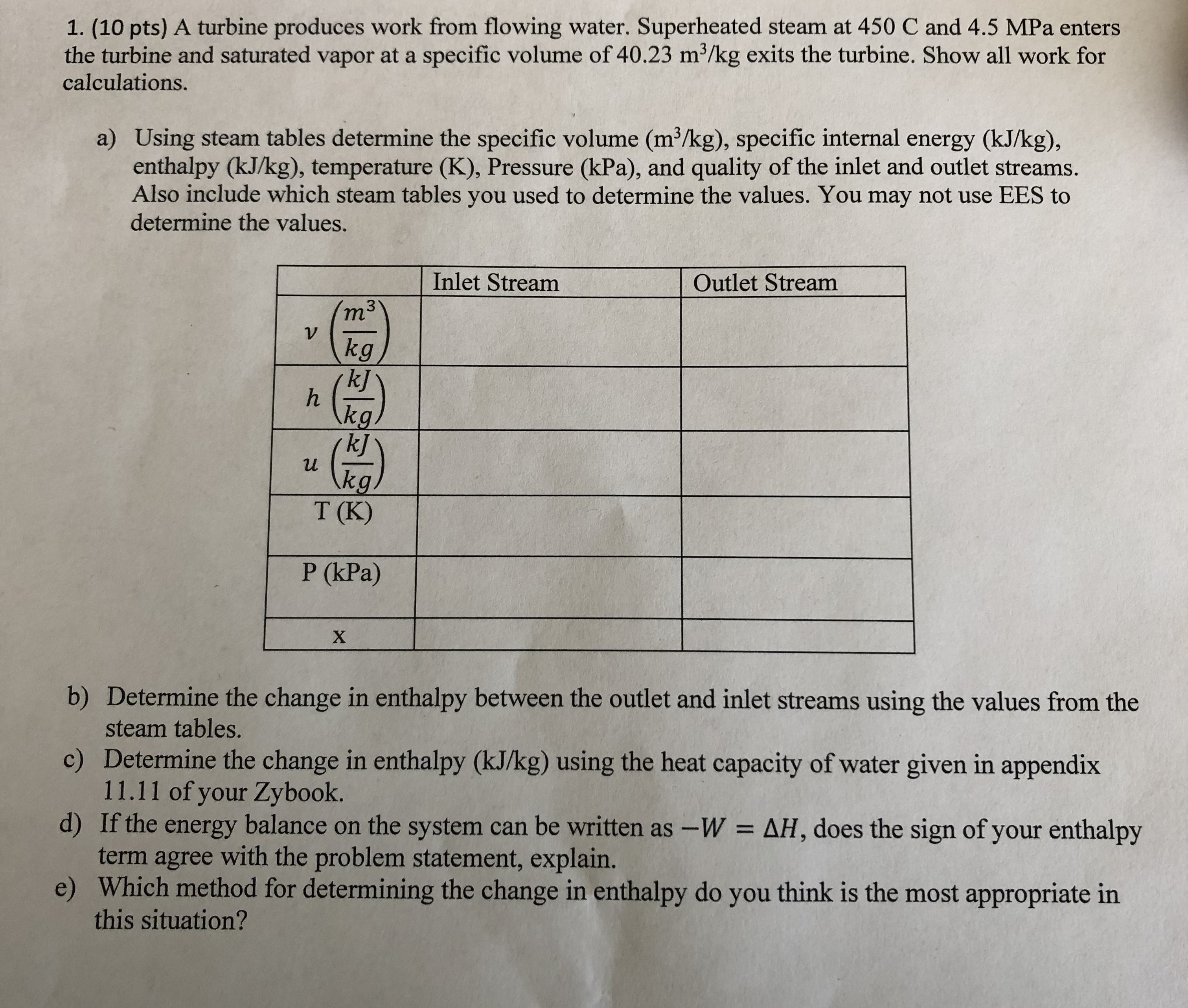 1. (10 pts) A turbine produces work from flowing water. Superheated...