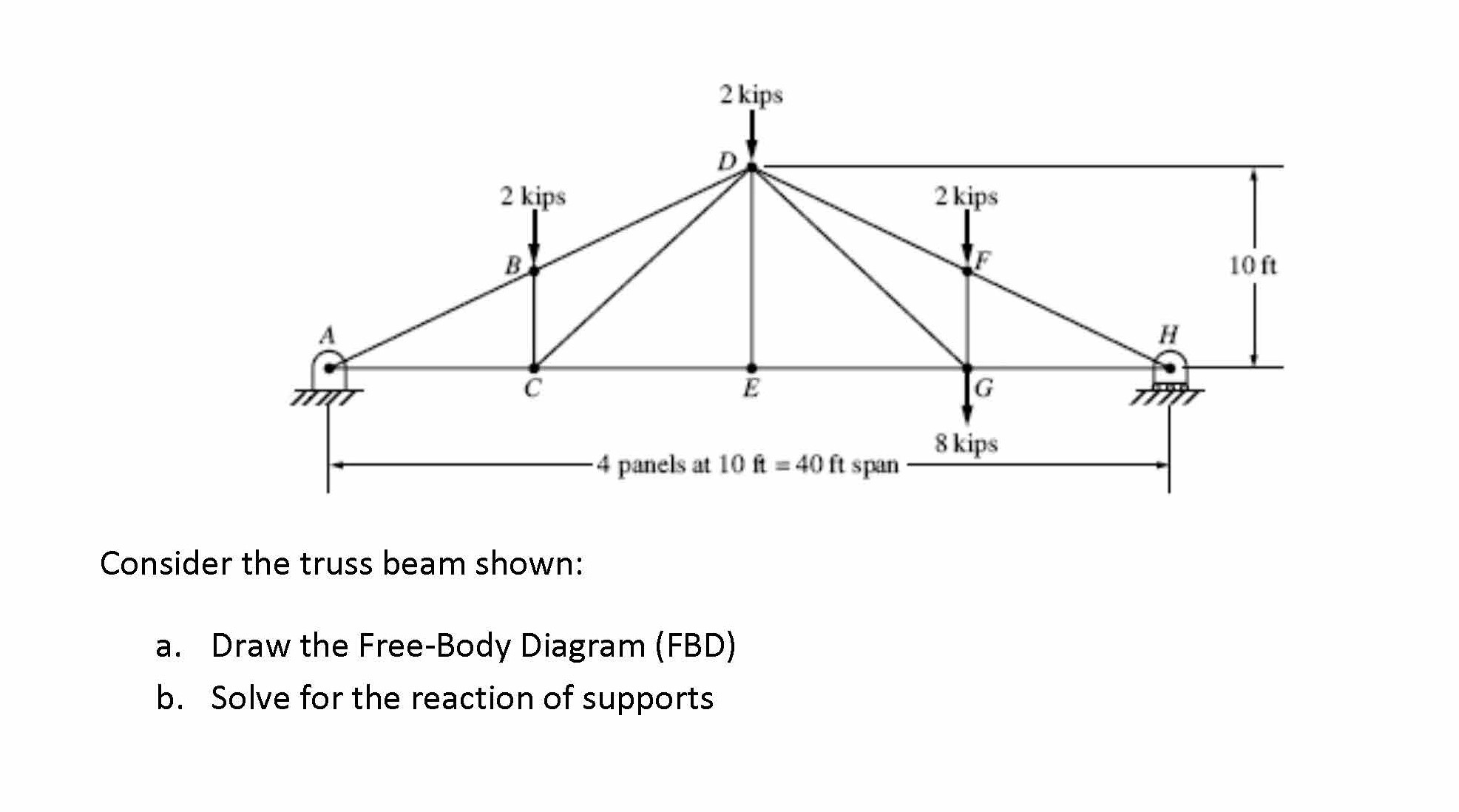 Consider the truss beam shown: a. Draw the Free-Body Diagram (FBD)...
