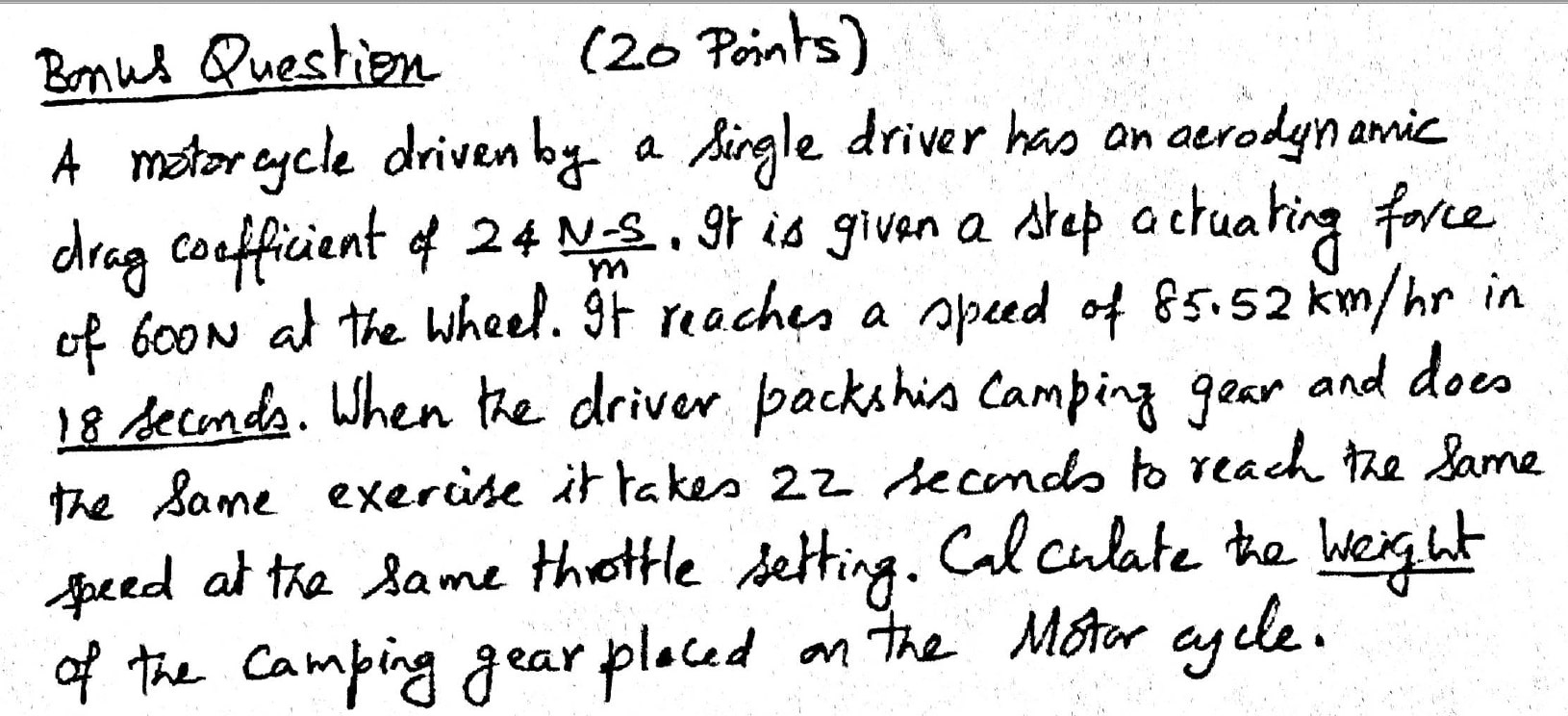 Bonus Question (20 Points) A motorcycle driven by a single driver...