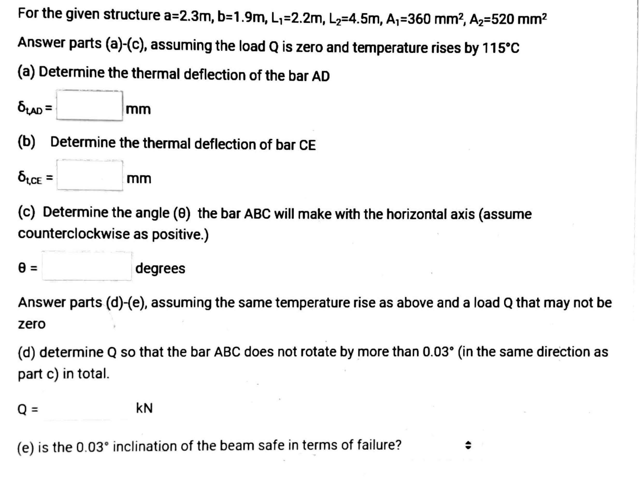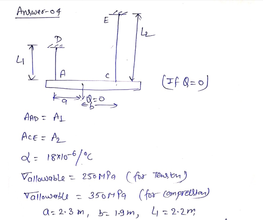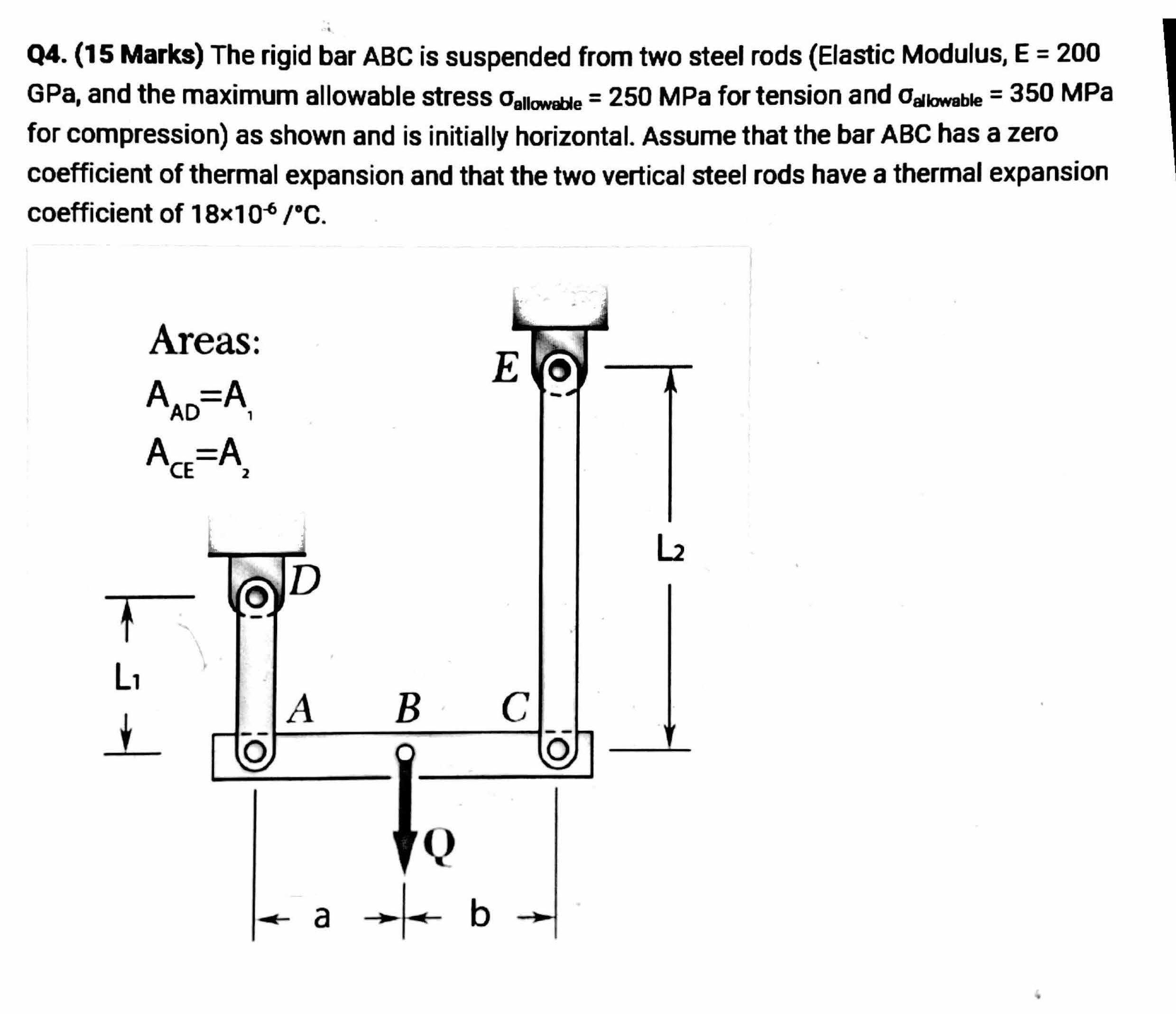 Q4. (15 Marks) The rigid bar ABC is suspended from two steel rods (...