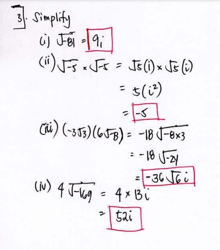 3. Simplify (i) √-81 (ii) √-5 x √-5 (iii) (-3 √3)(6√-8) (...