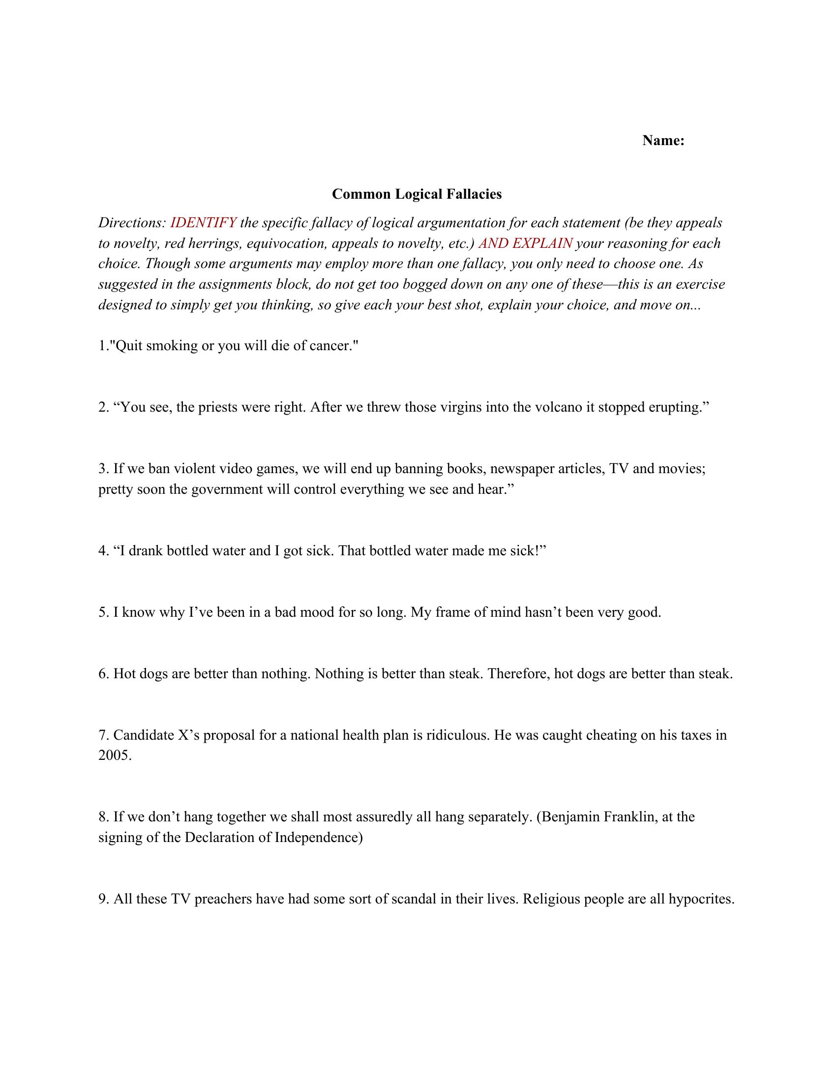 Name: Common Logical Fallacies Directions: IDENTIFY the specific...
