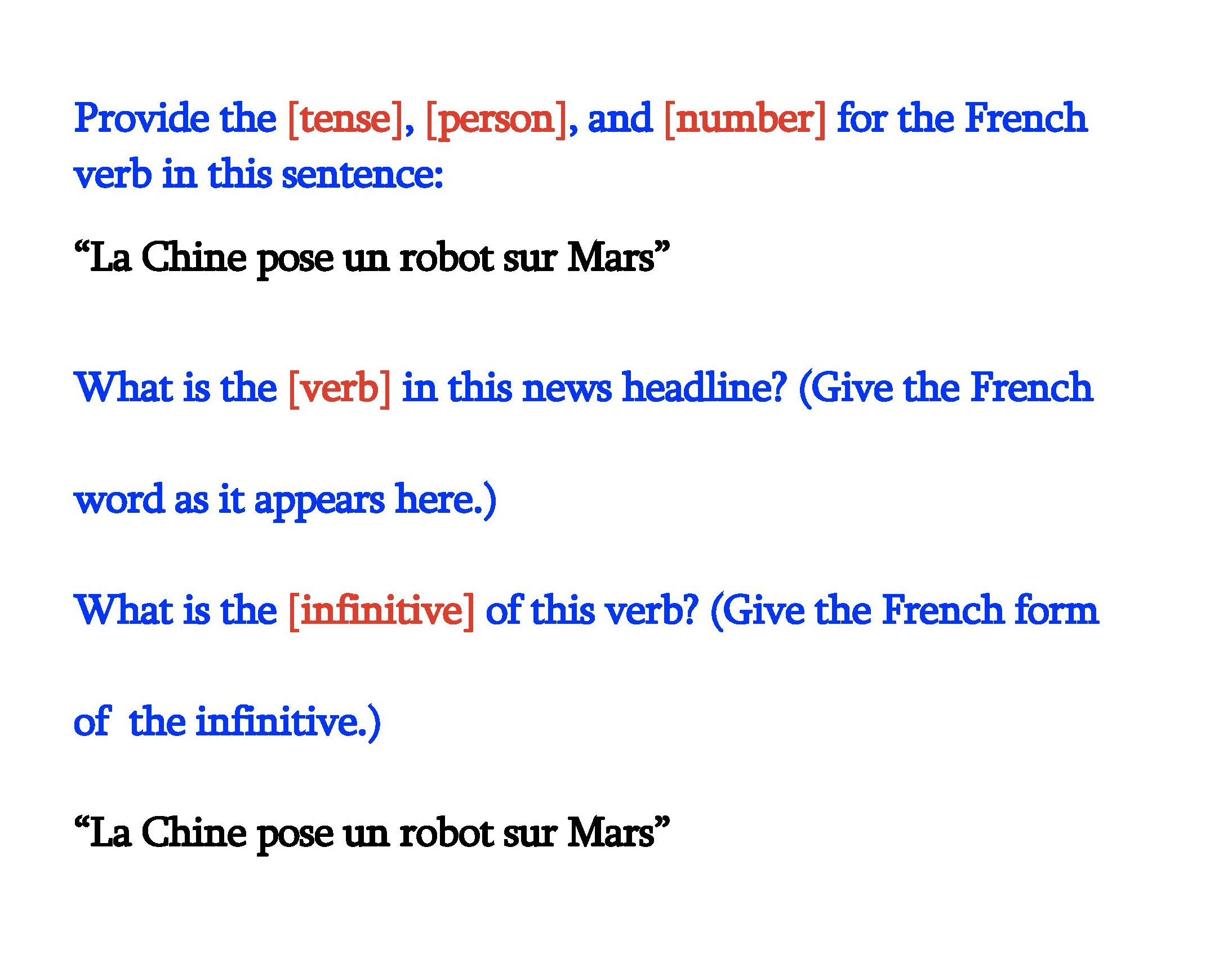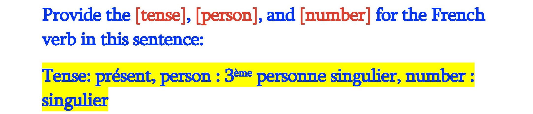 Provide the [tense], [person], and [number] for the French verb in...