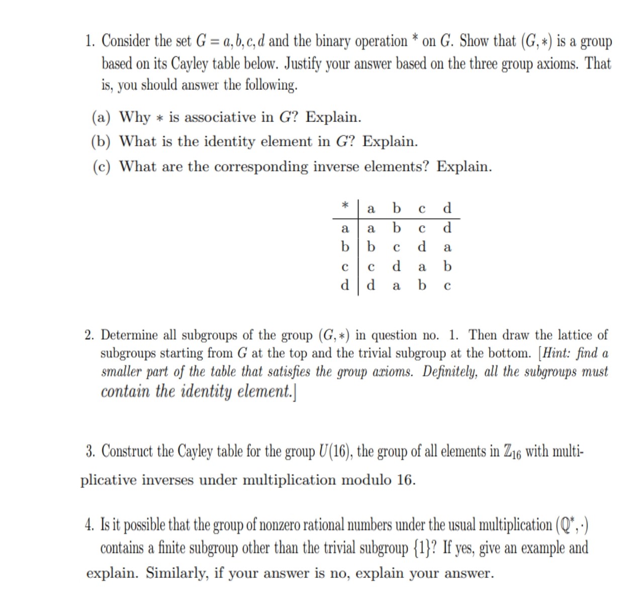 1. Consider the set G = a, b, c, d and the binary operation * on G....