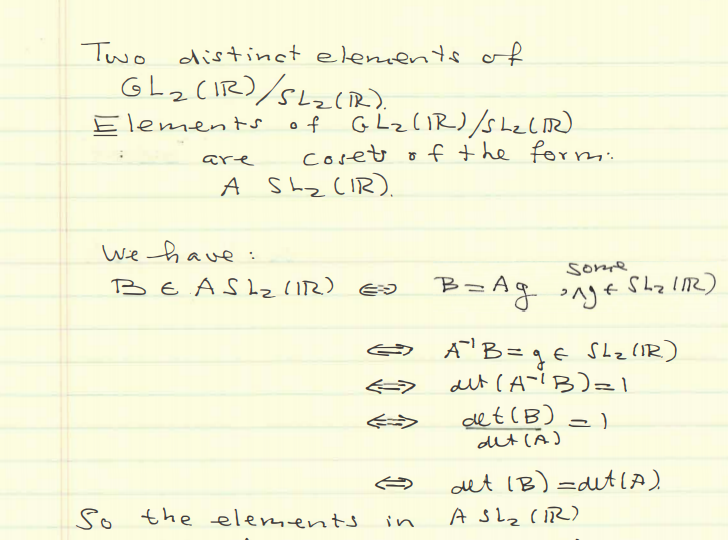 Find two distinct elements of GLâ‚‚(R)/SLâ‚‚(R).