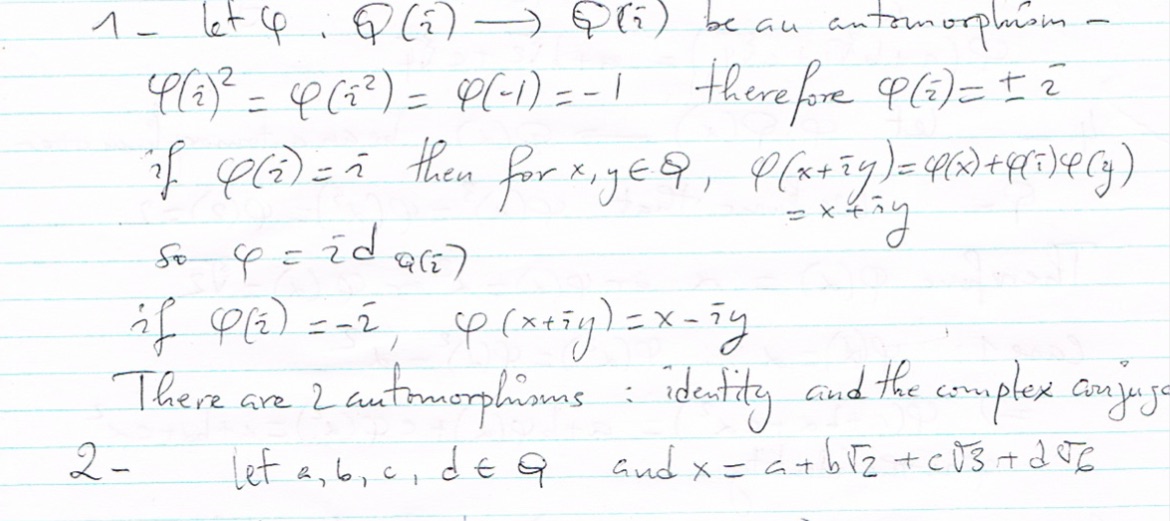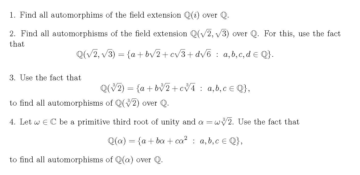 1. Find all automorphims of the field extension Q(i) over Q. 2. Fi...
