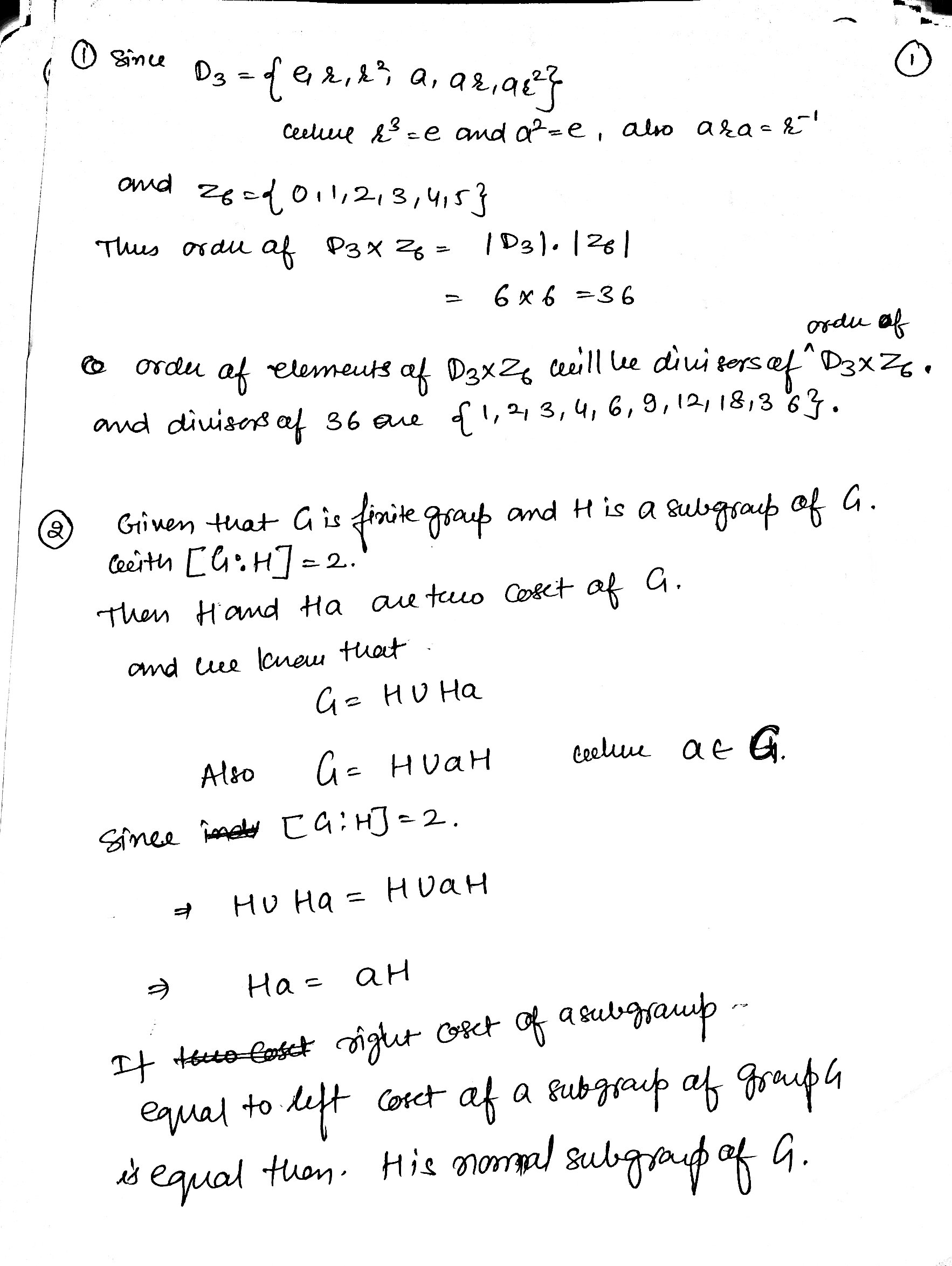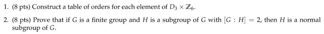 1. (8 pts) Construct a table of orders for each element of D3 X Z6....