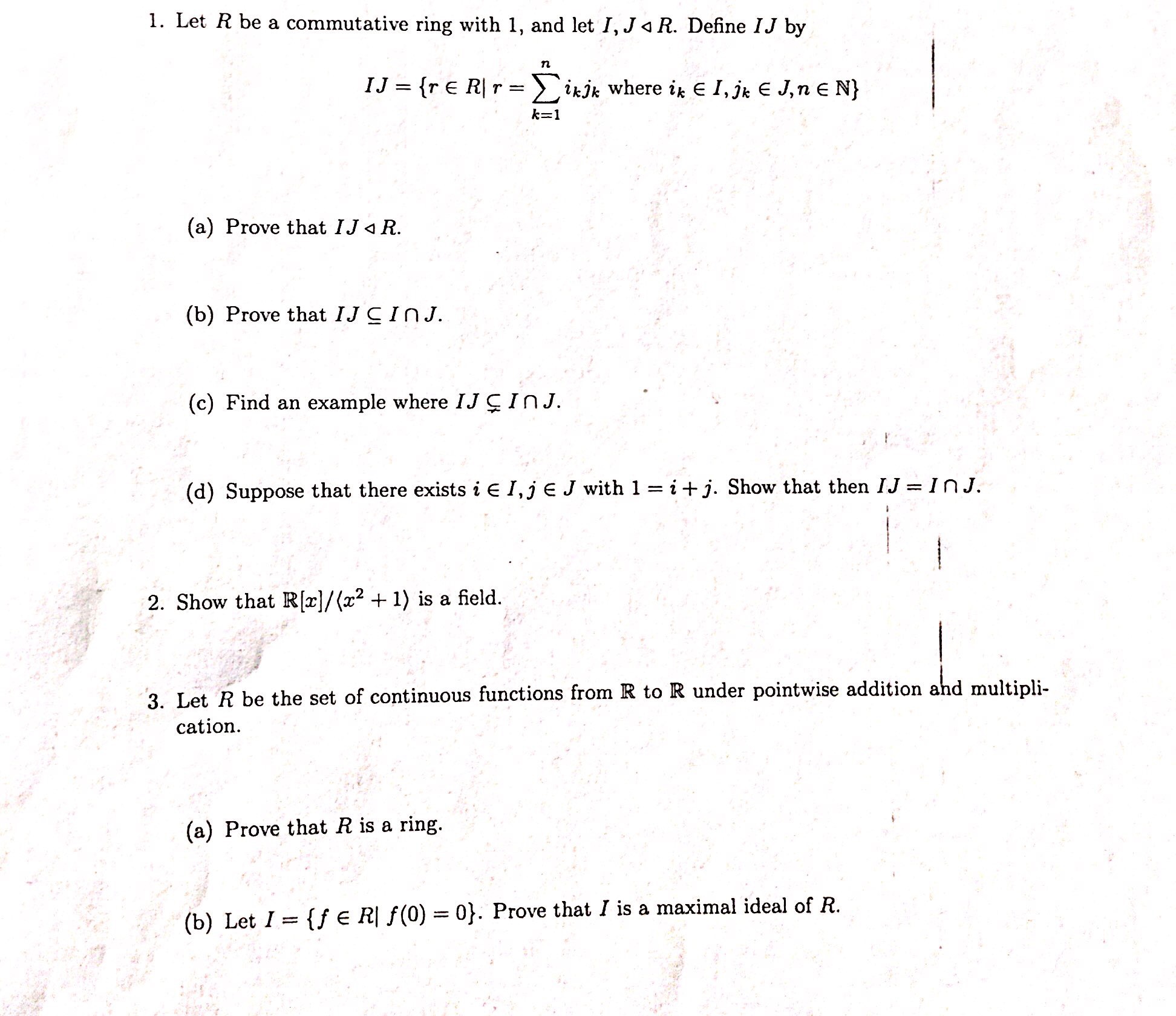 1. Let R be a commutative ring with 1, and let I, J a R. Define IJ ...