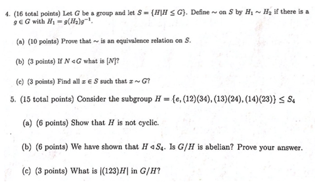 4. (16 total points) Let G be a group and let S = {H|H G}. Define ~...