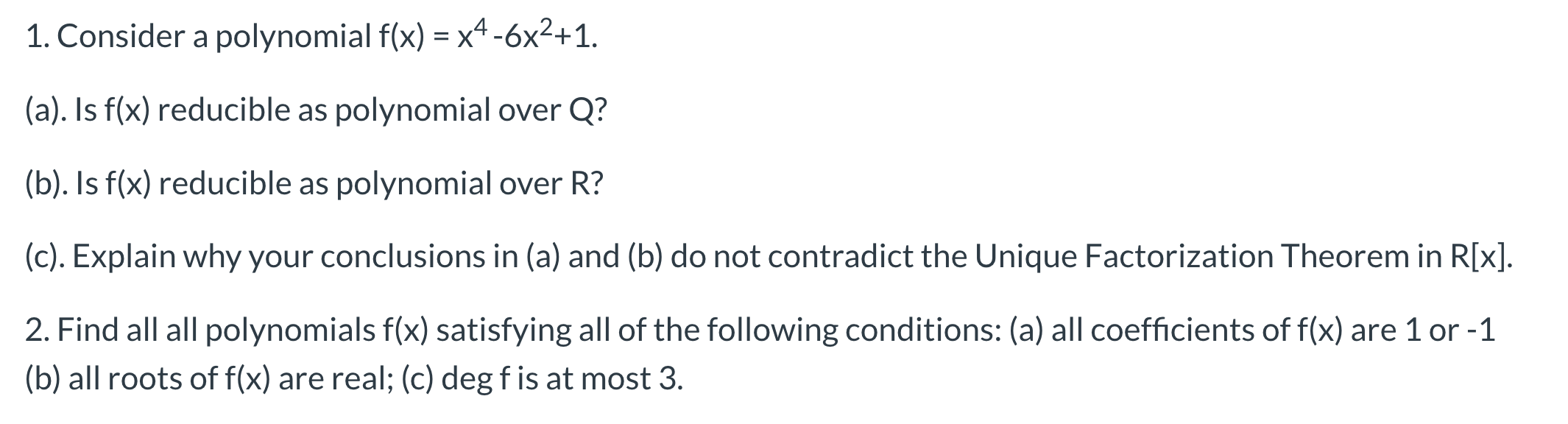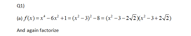 1. Consider a polynomial f(x) = x 4 -6x2+1. (a). Is f(x) reducible...