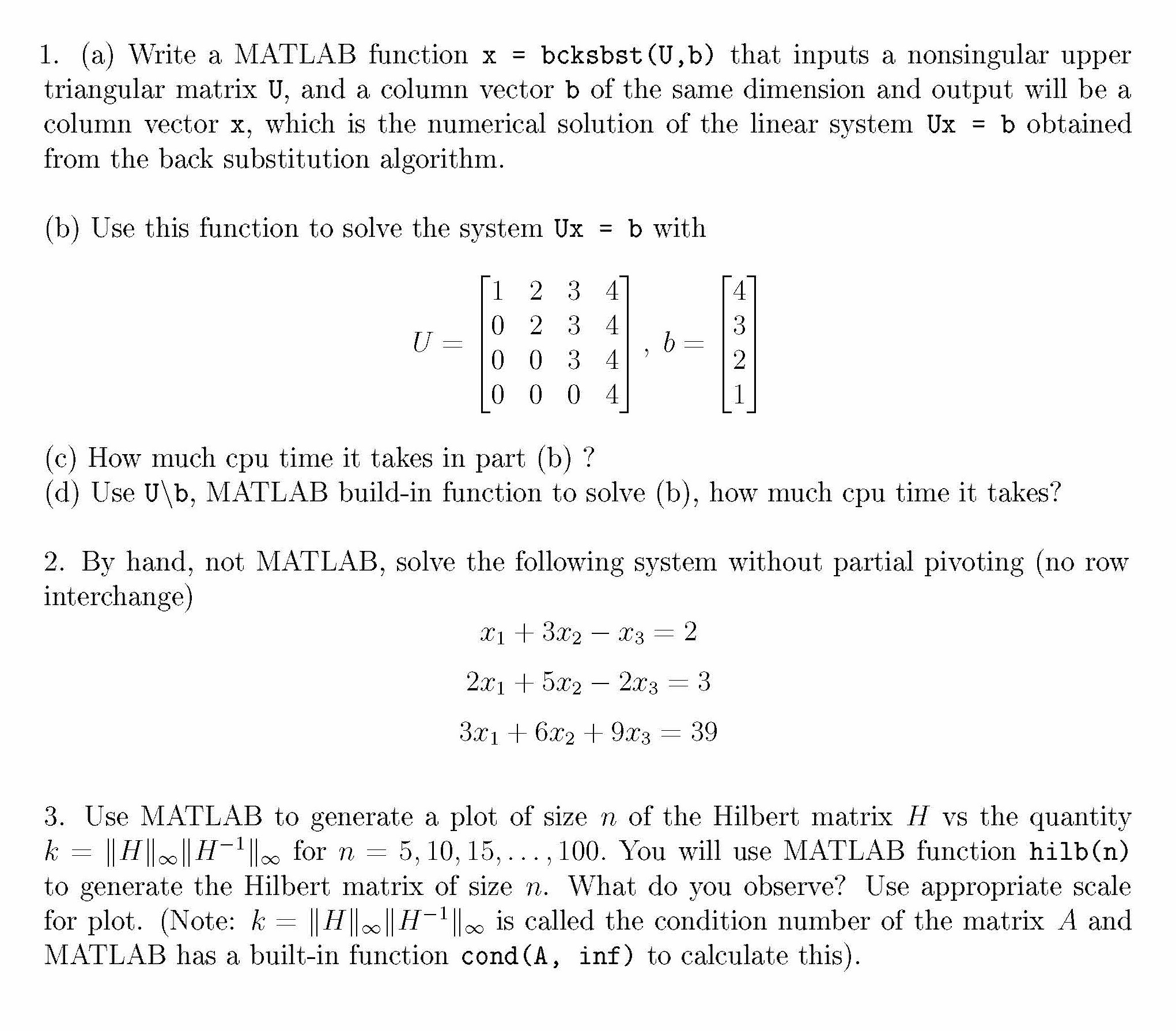 1. (a) Write a MATLAB function x = bcksbst(U,b) that inputs a nonsi...