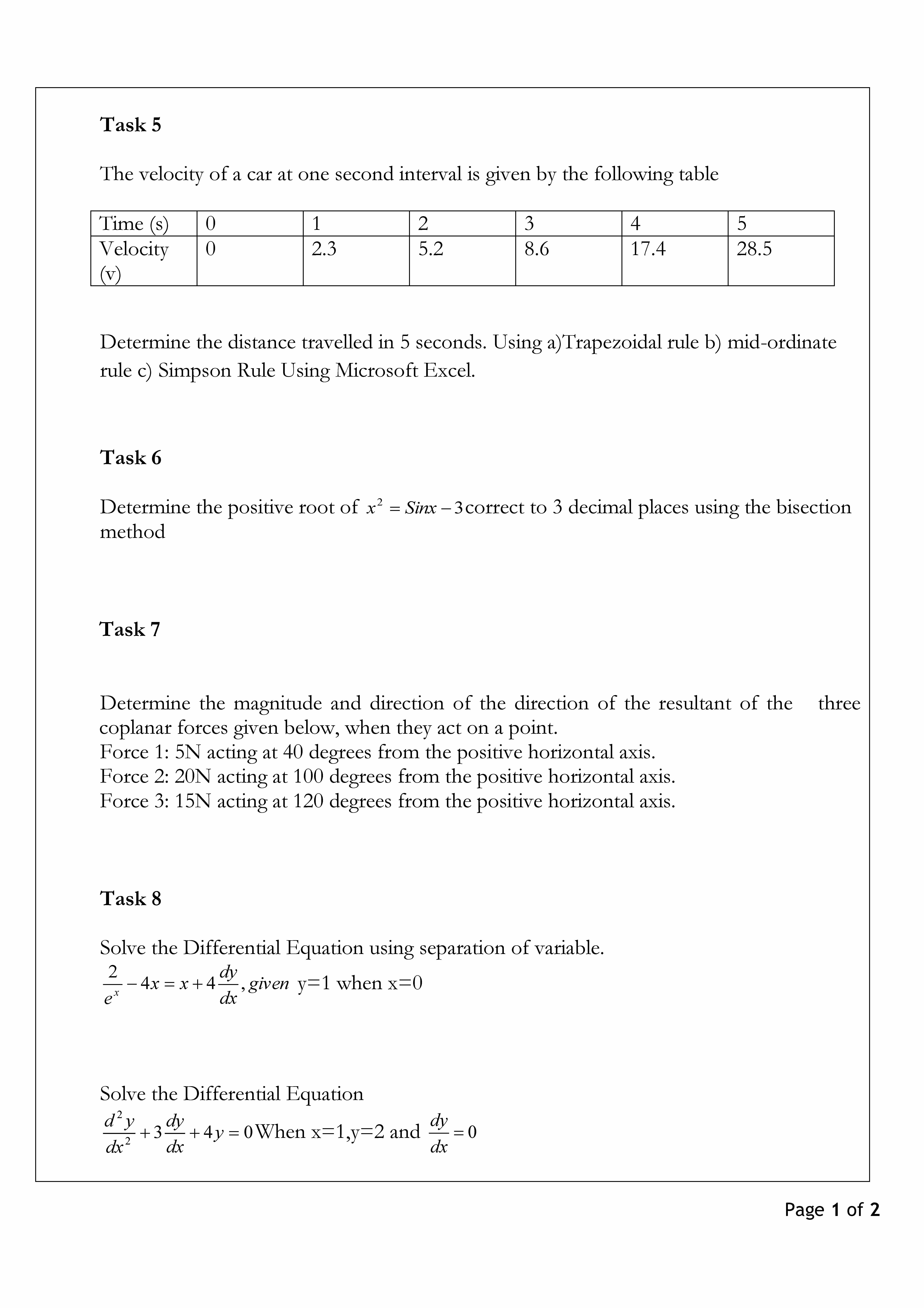 Task 5 The velocity of a car at one second interval is given by th...