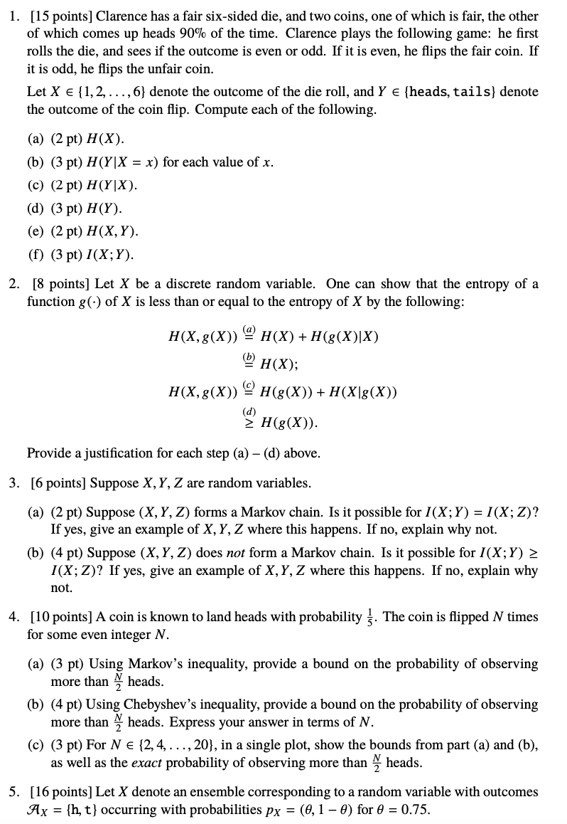 1. [15 points] Clarence has a fair six-sided die, and two coins, on...