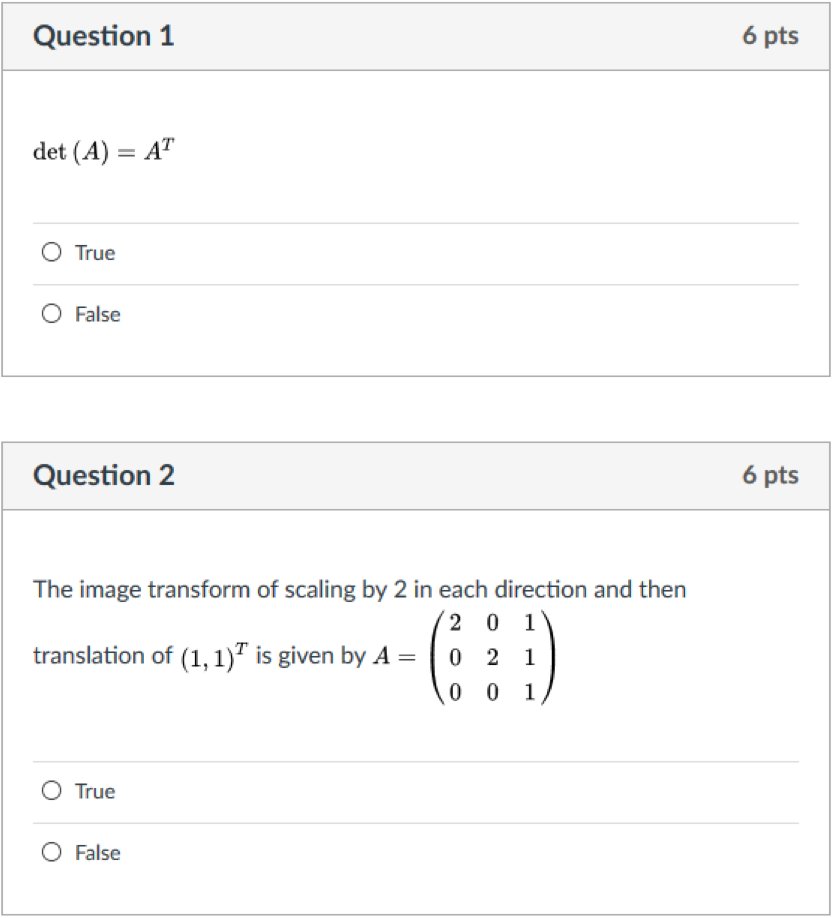 Question 1 6 pts det (A) = AT True False Question 2 6 pts Th...