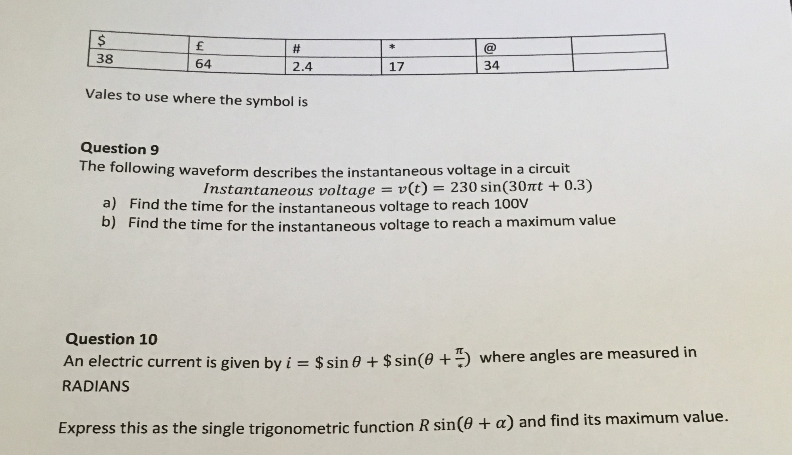 $ £ # * @ 38 64 2.4 17 34 Vales to use where the symbol...