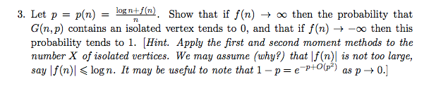 3. Let p = p(n) = logn+f(n) Show that if f(n) 80 then the probabil...
