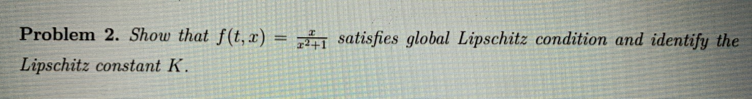 Problem 2 Show that f (t,x) = x x2 + 1 satisfies global Lipschitz c...