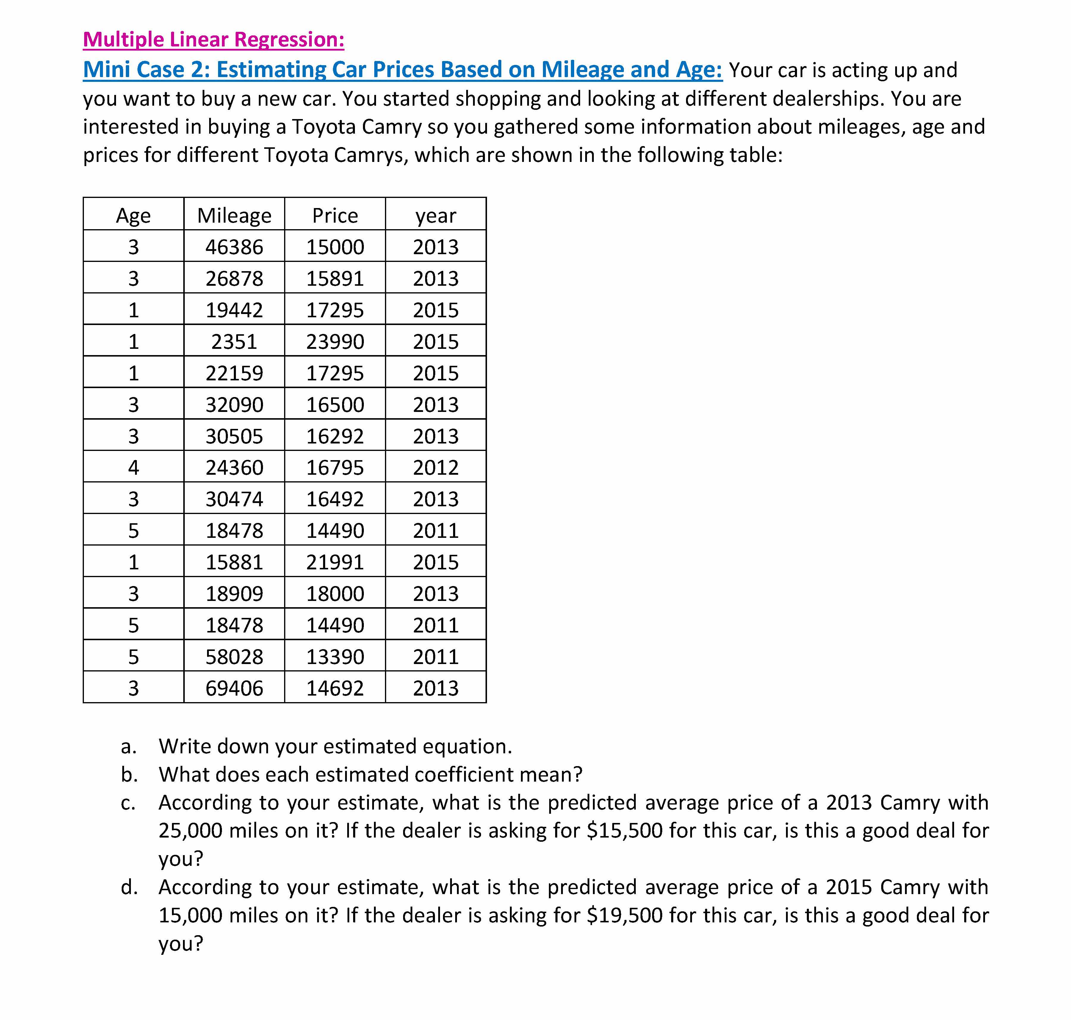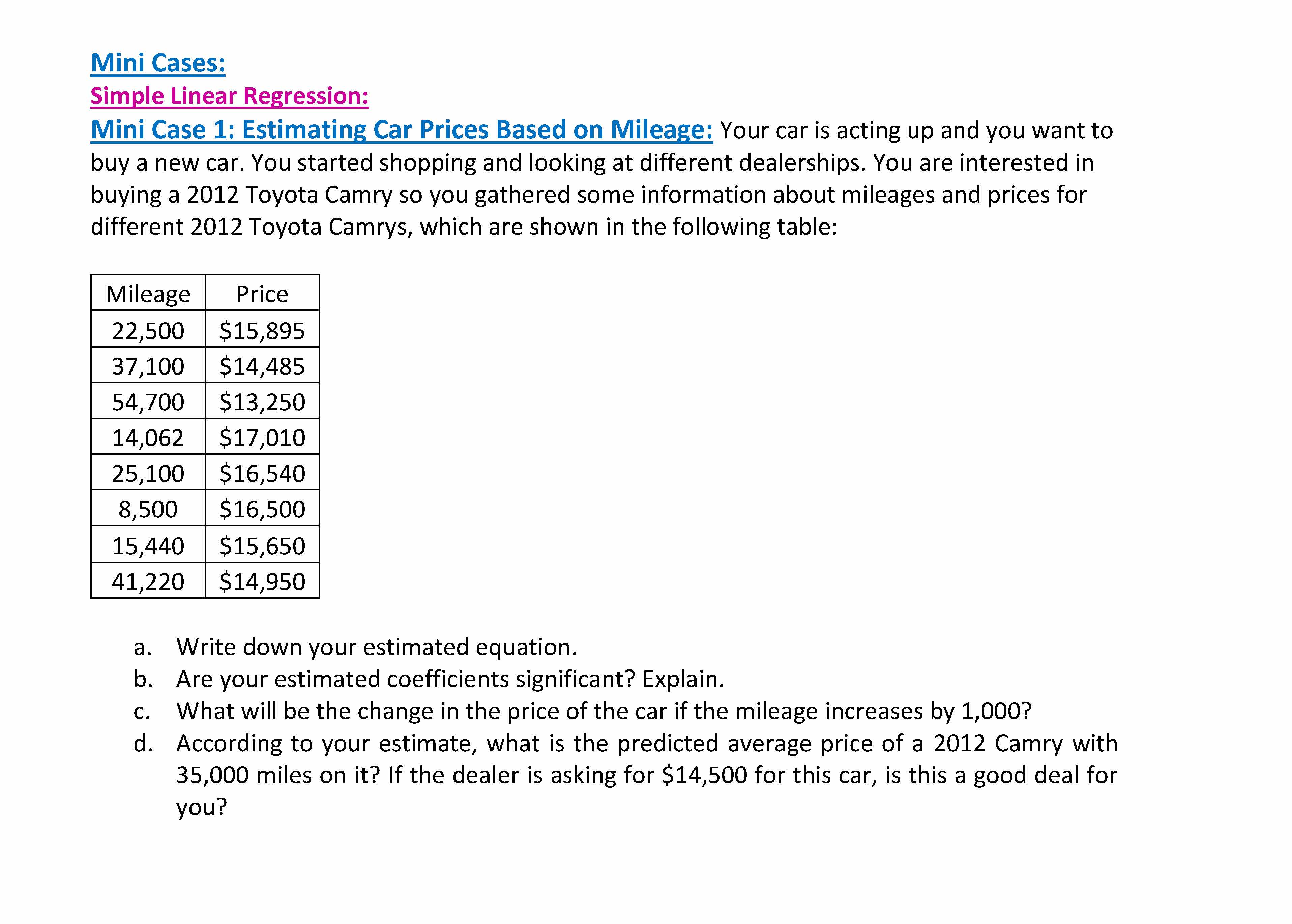 Mini Cases: Simple Linear Regression: Mini Case 1: Estimating Car...