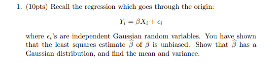 1. (10pts) Recall the regression which goes through the origin: Yi...