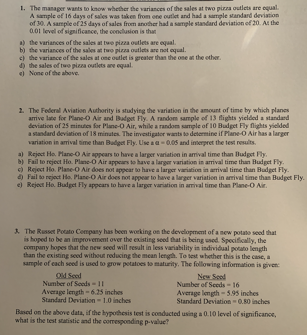 1. The manager wants to know whether the variances of the sales at...