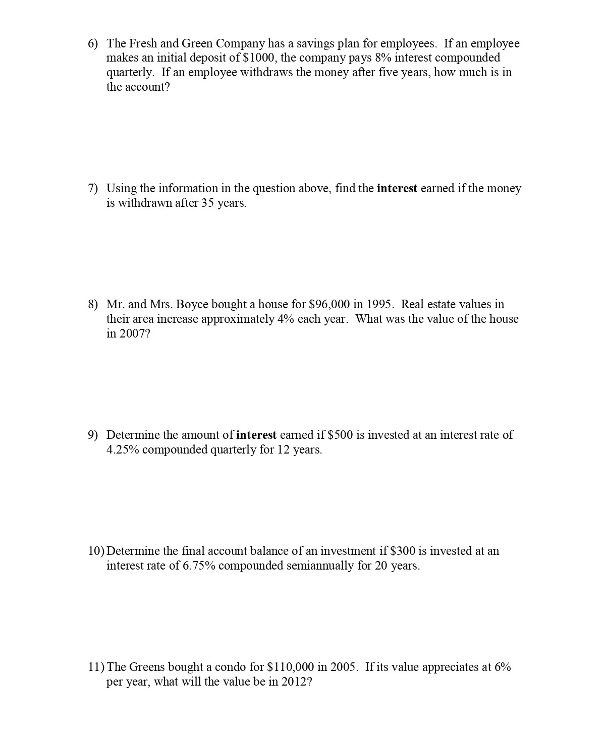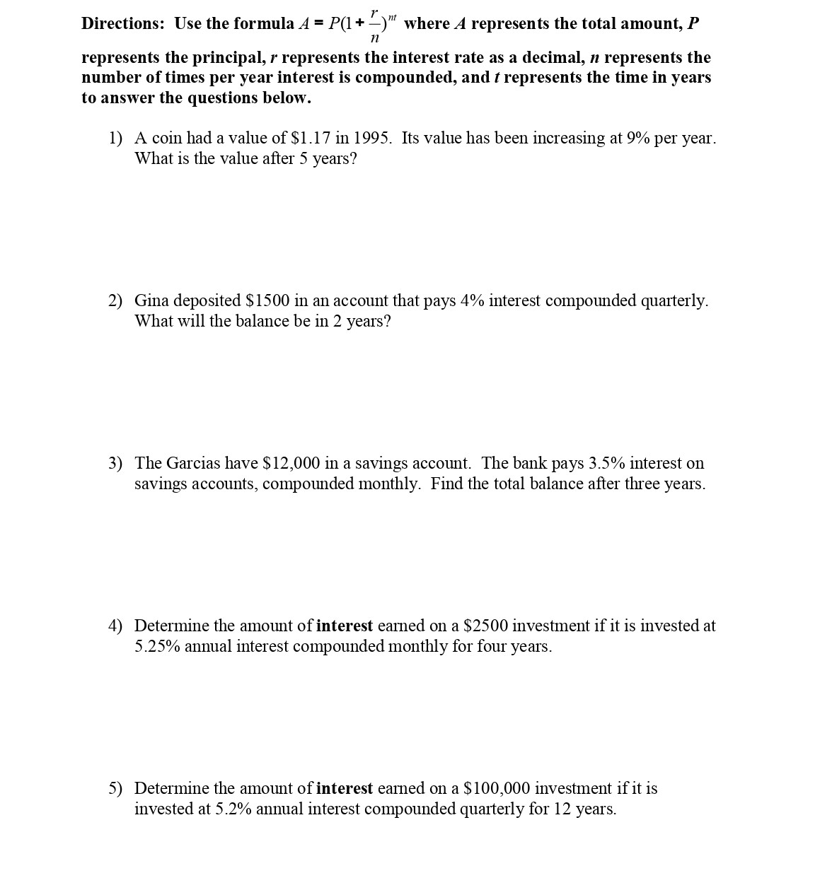 Directions: Use the formula A = P(1+-)" where A represents the...