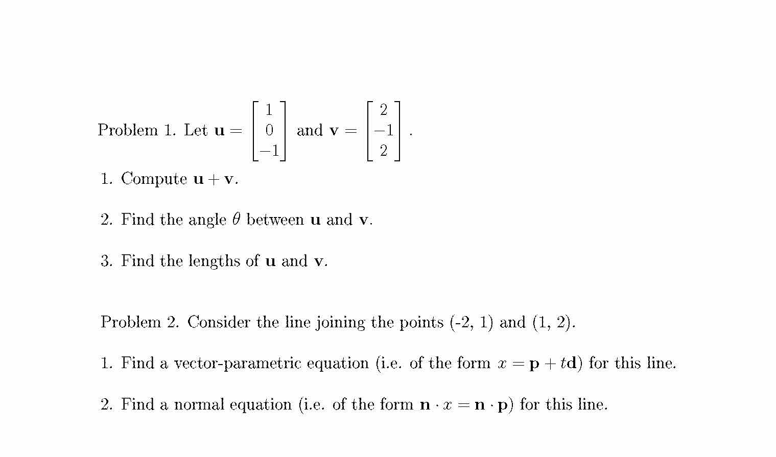 Problem 1. Let u = 1 0 −1 and v = 2 −1 2 . 1. Compute...