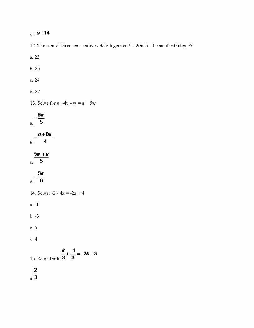 1. Solve: 4x + 1 = x - 3 a. b. c. d. 2. The length of a rectan...