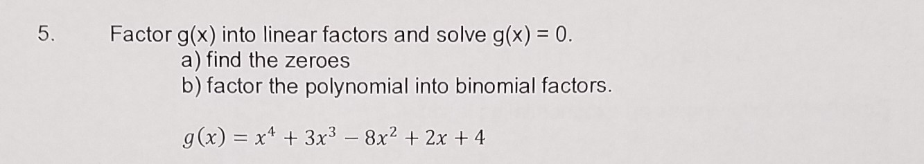 5. Factor g(x) into linear factors and solve g(x) = 0. a) find th...