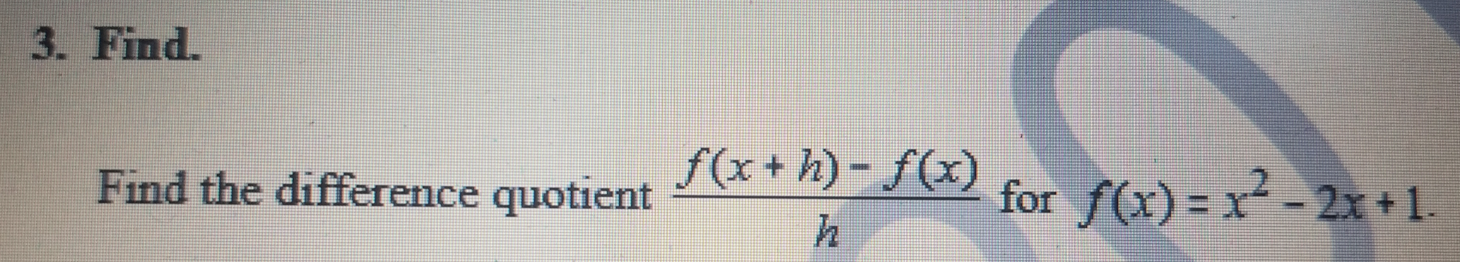 3. Find. Find the difference quotient for f(x)= f(x+h)-f(x) h