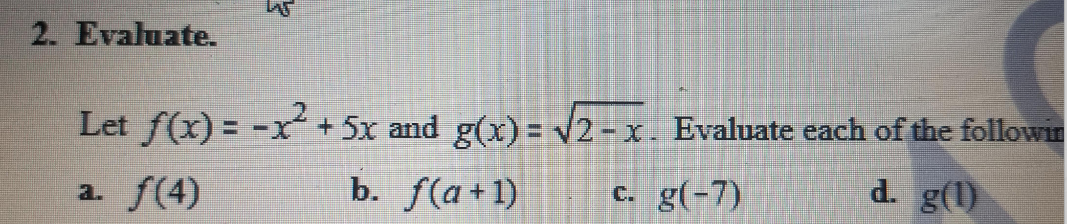 Let f(x)=-x 2 +5x and g(x)= 2-x. Evaluate each of the ...