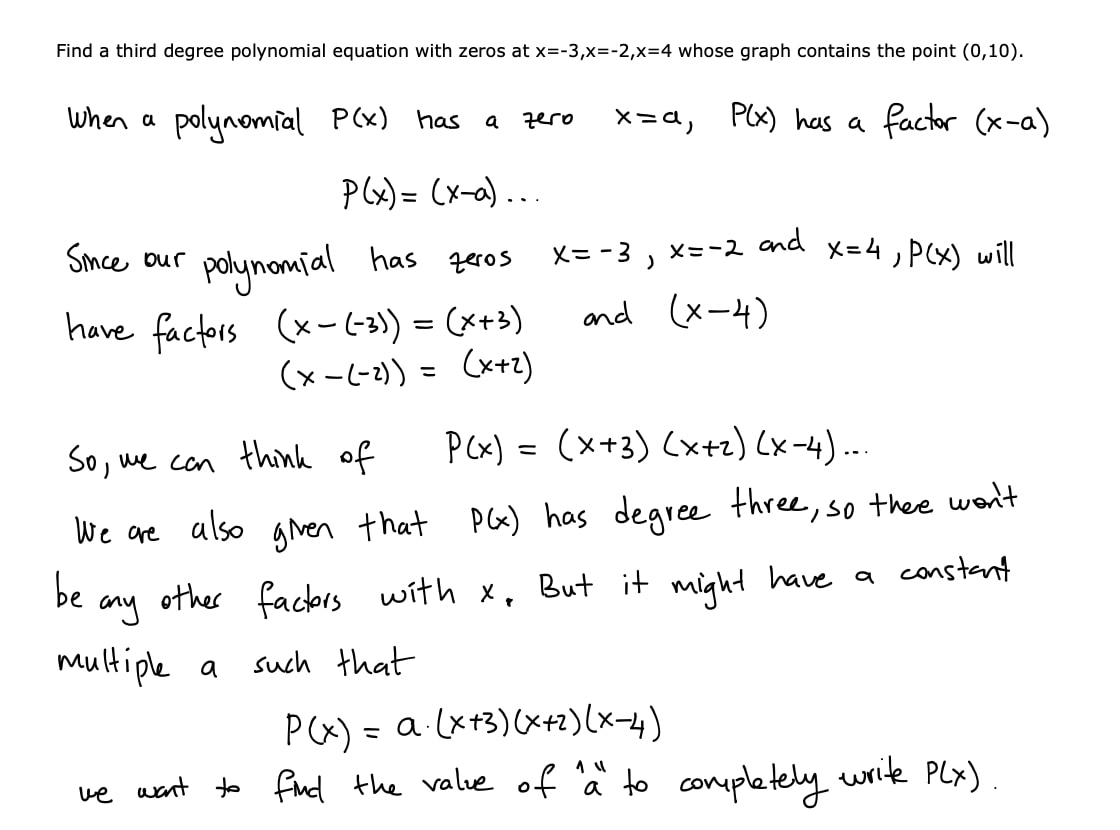 Find a third degree polynomial equation with zeros at x=-3,x=-2,x=4...