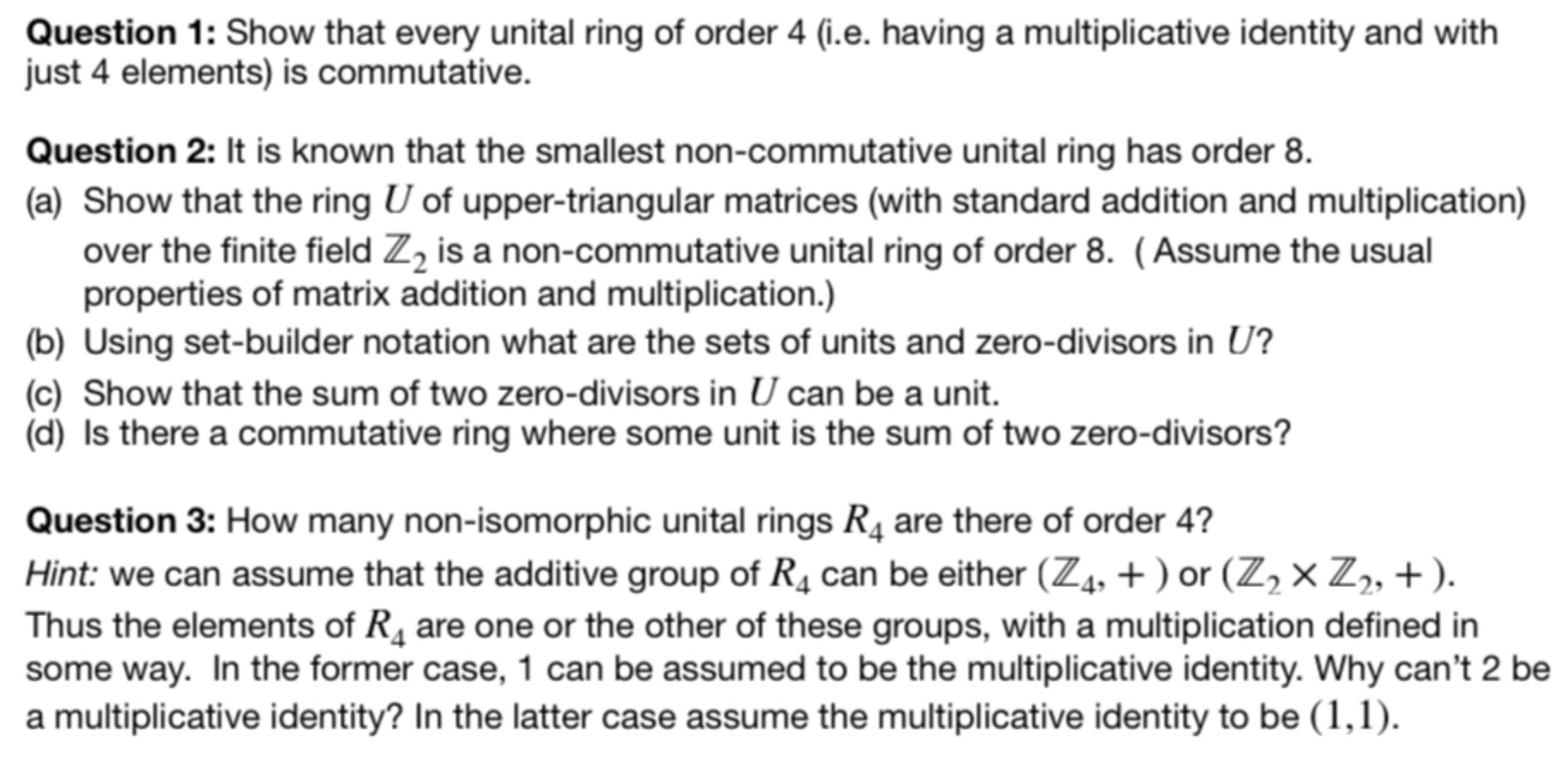 Question 1: Show that every unital ring of order 4 (i.e. having a ...