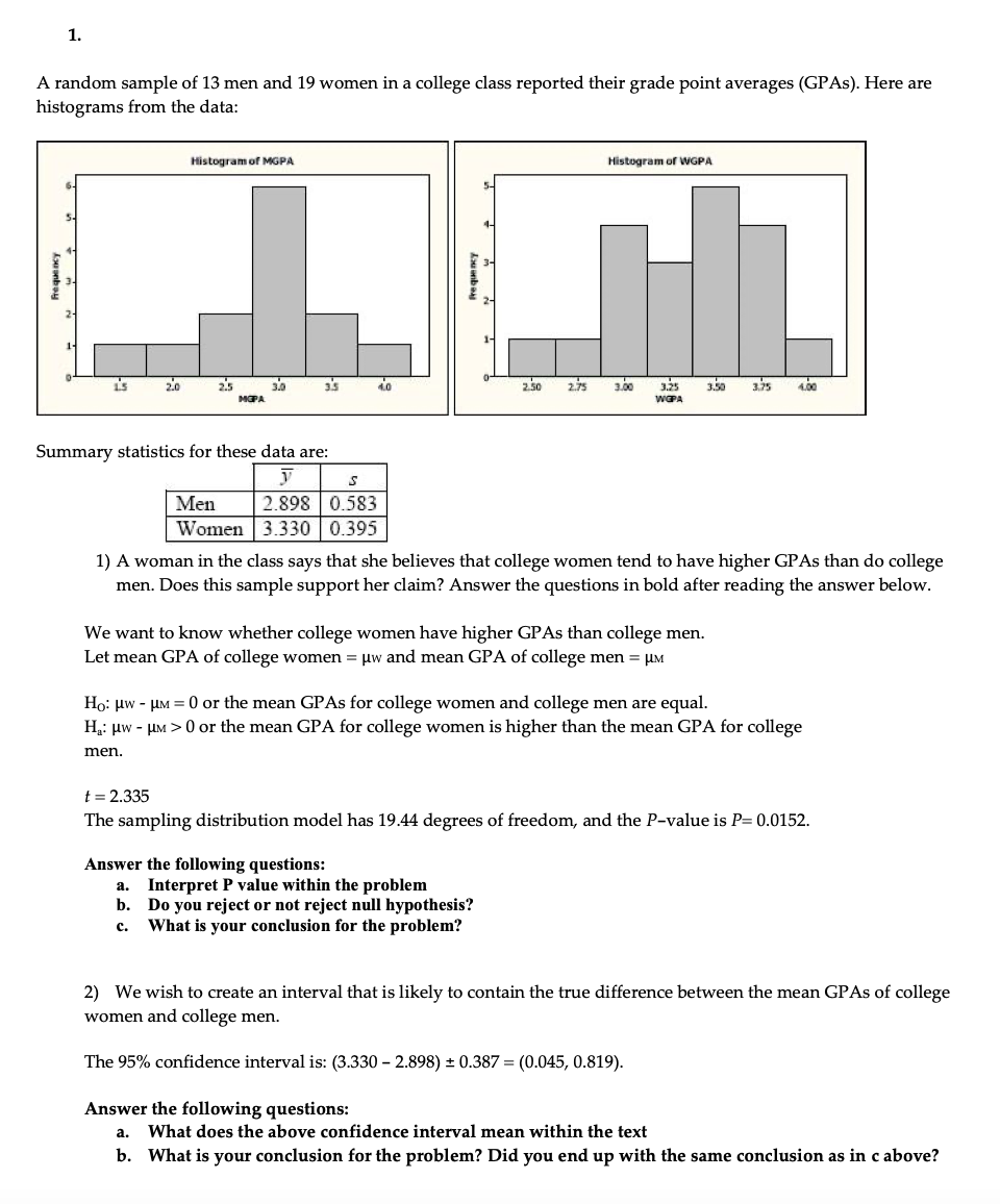 1. A random sample of 13 men and 19 women in a college class repor...